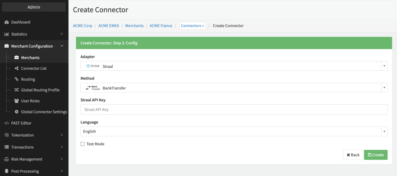Send FeedbackStraalStraal Configure the following parameters for the Connector (see Connector Config - Straal): Fill in the mandatory Straal API Key Connector Config - Straal