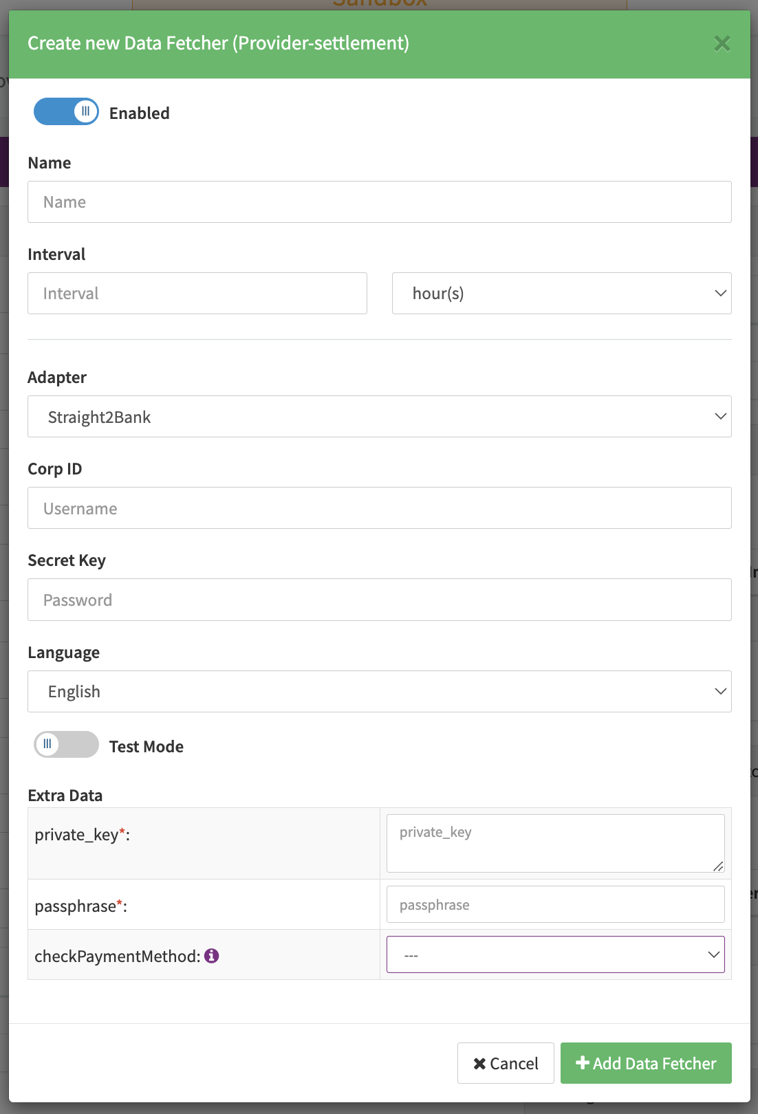 - Fill in the mandatory Extra Data: private_key - string, required for API request signing
