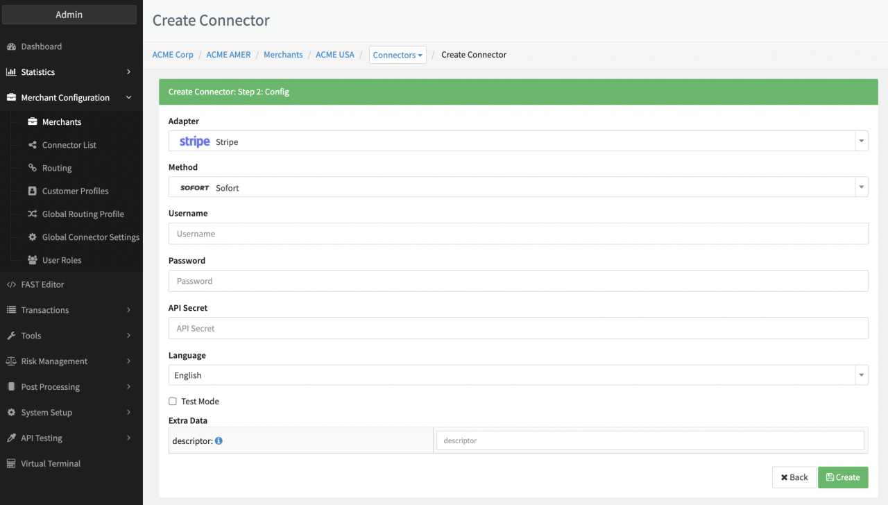 - Fill in the mandatory Extra Data: connectAccountId (for Stripe Connect Accounts)