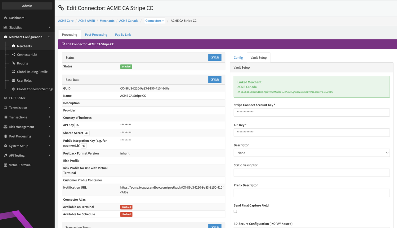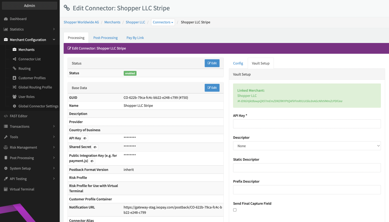 Configure the following parameters for the Connector (see Connector Detail Overview - Stripe Connect Creditcard - Vault Configuration):