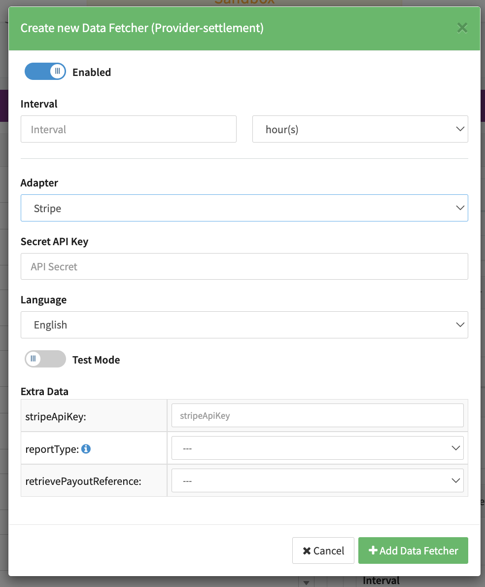 - Enable Testmode to test fetching of Provider Settlements from the Stripe Sandbox (URL used …), disabled the Stripe Production (URL …) environment is used