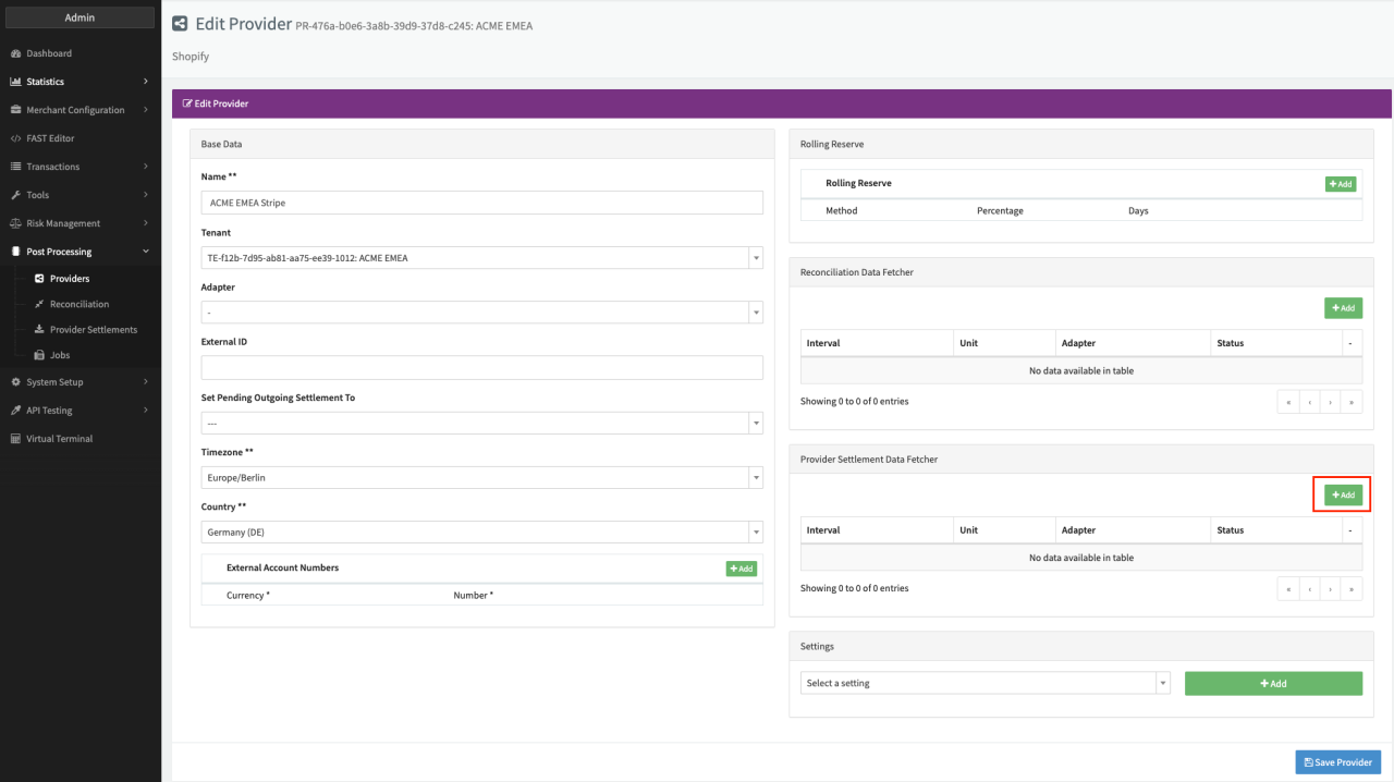 - Fill in the expected Interval in which the Provider Settlement File should be fetched - days, hours