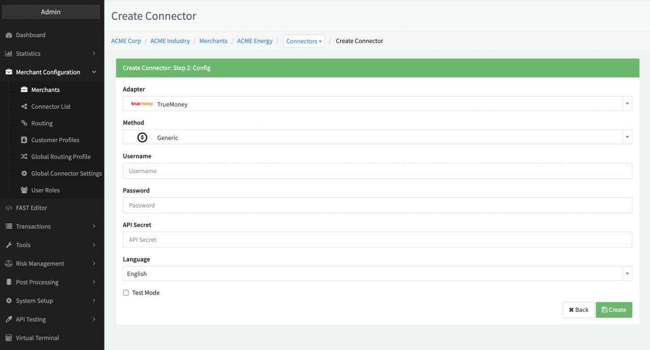 Configure the following parameters for the Connector (see Connector Config - TrueMoney):