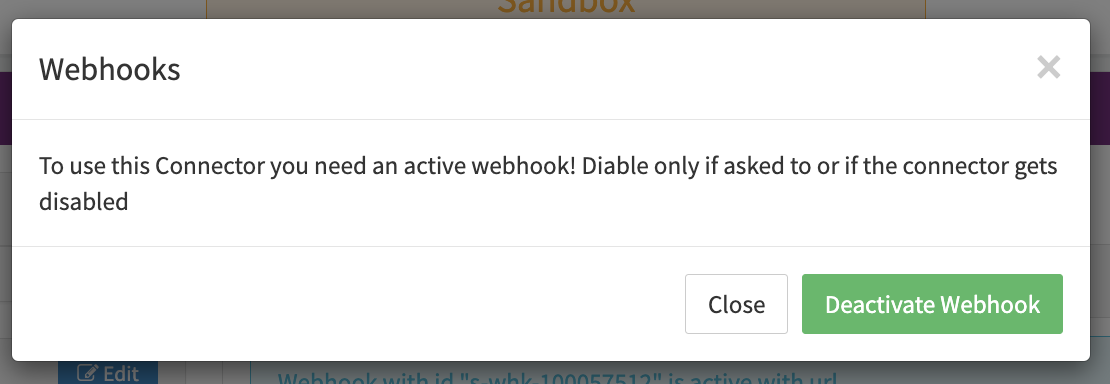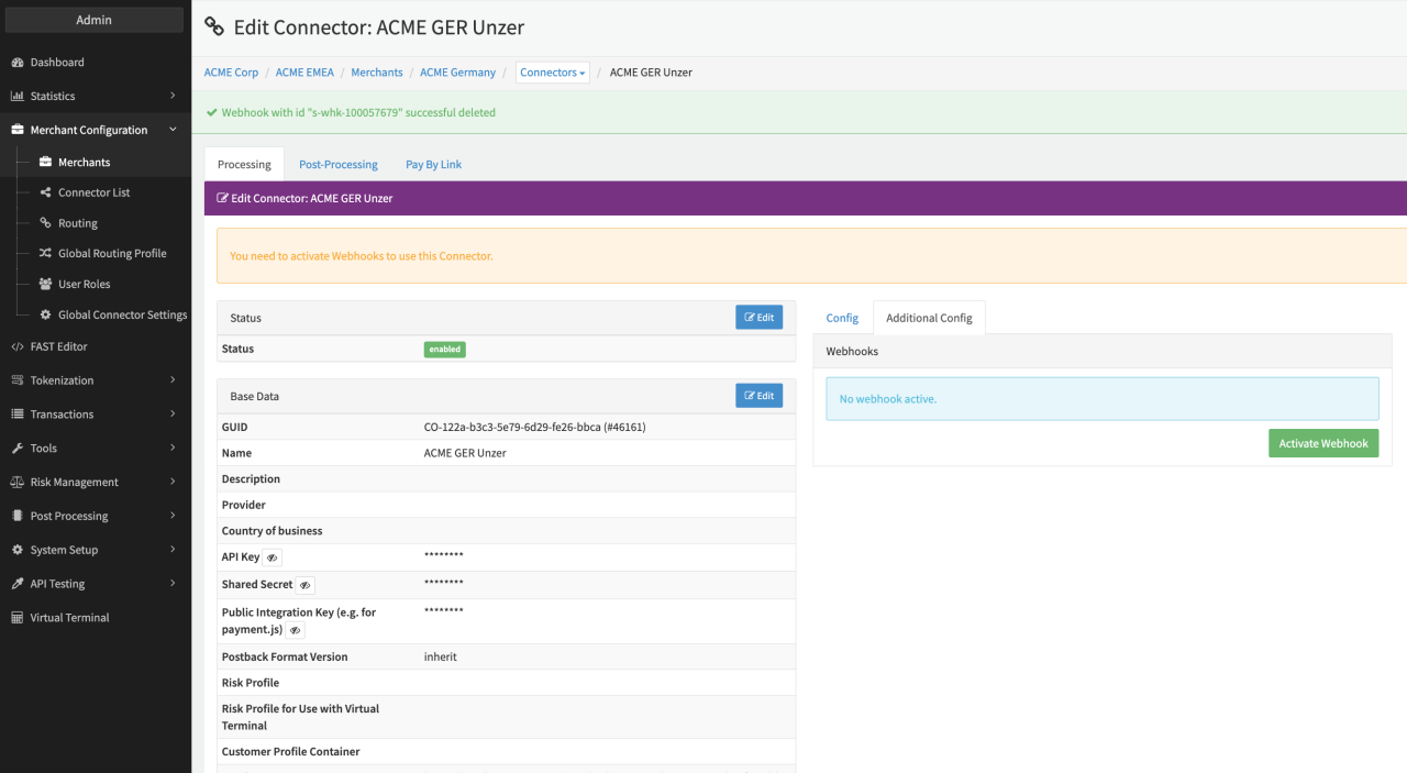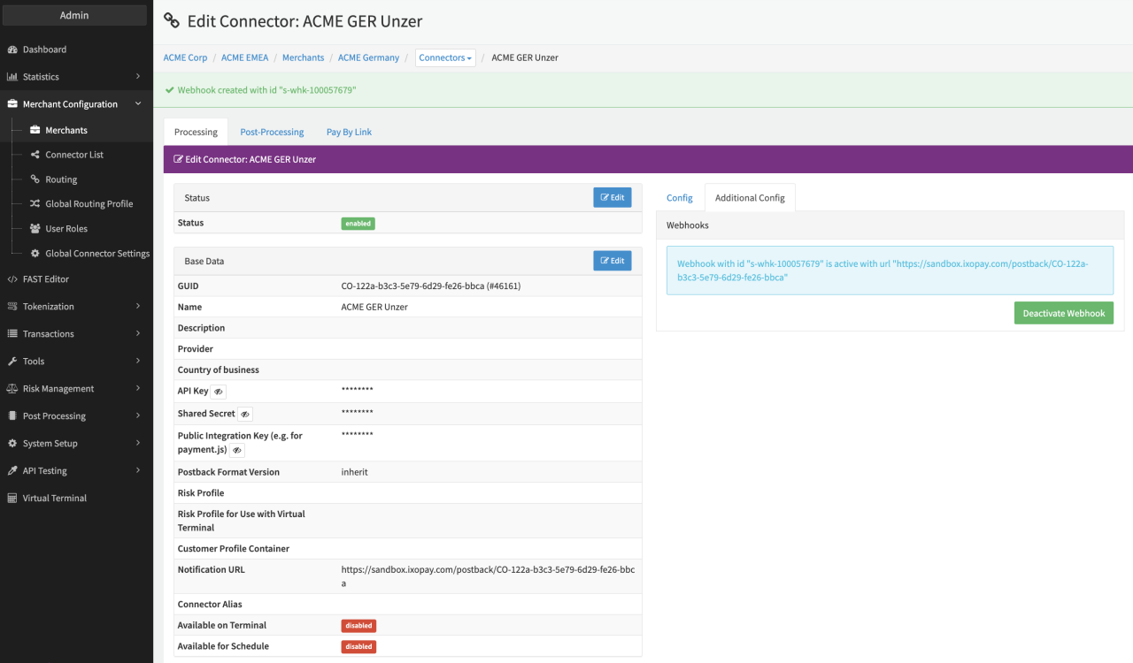 After activation, the registered URL is shown in the Additional Config tab (see Additional Config Webhook) and can be deactivated (see Confirmation Deactivation, Deactivation) any time.