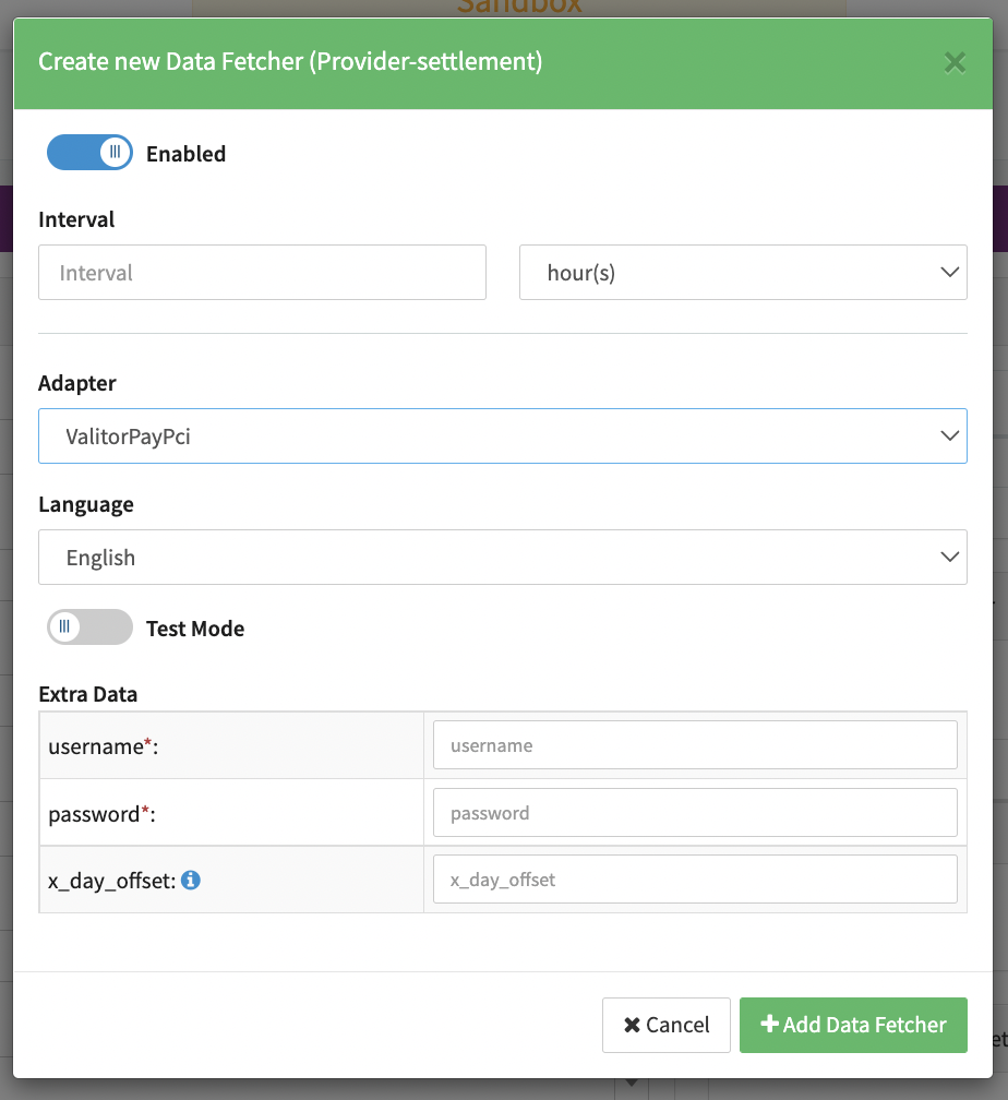 - Enable Testmode to test fetching of Provider Settlements from the ValitorPay Sandbox