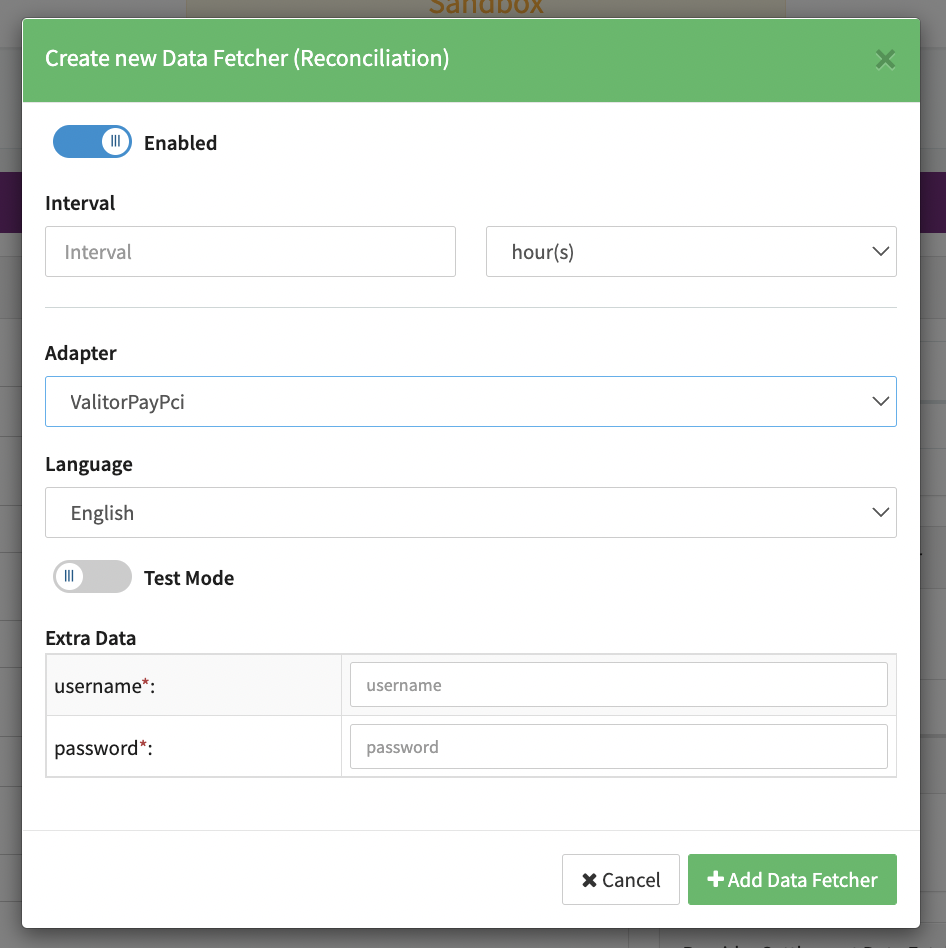 - Enable Testmode to test fetching of Reconciliation files from the ValitorPay Sandbox