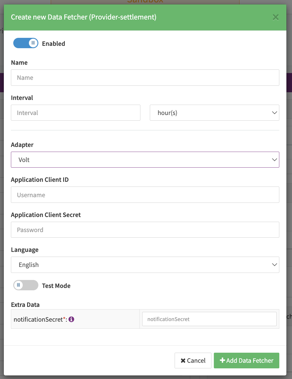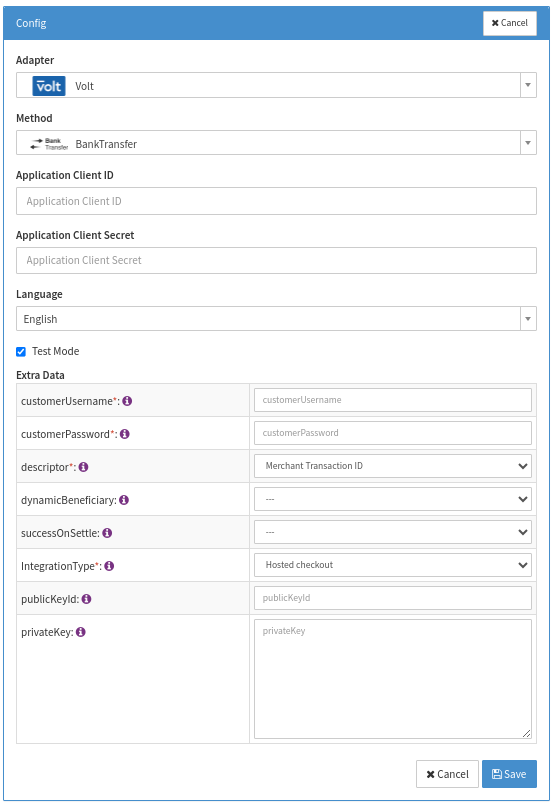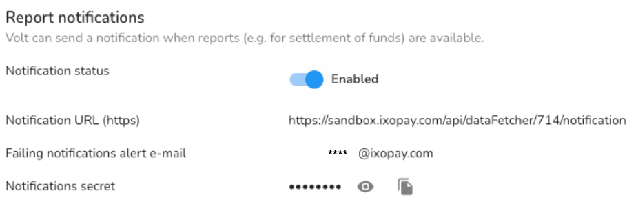- Fill in the mandatory Extra Data: notificationSecret used to receive Settlement Notifications from Volt. Should the value not be available before the notification URL (see Hint) must be given to Volt please enter a dummy value until it is available. Please be aware that the real notification secret is required to successfully receive settlements.