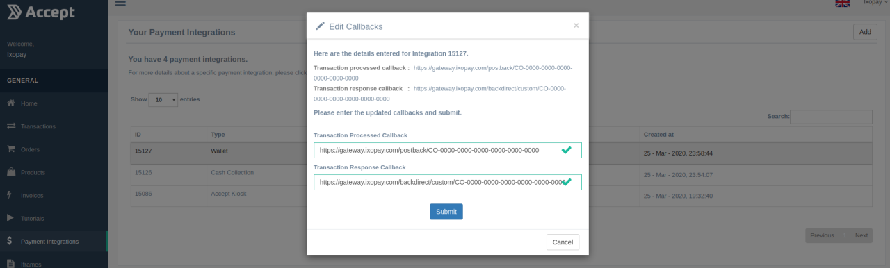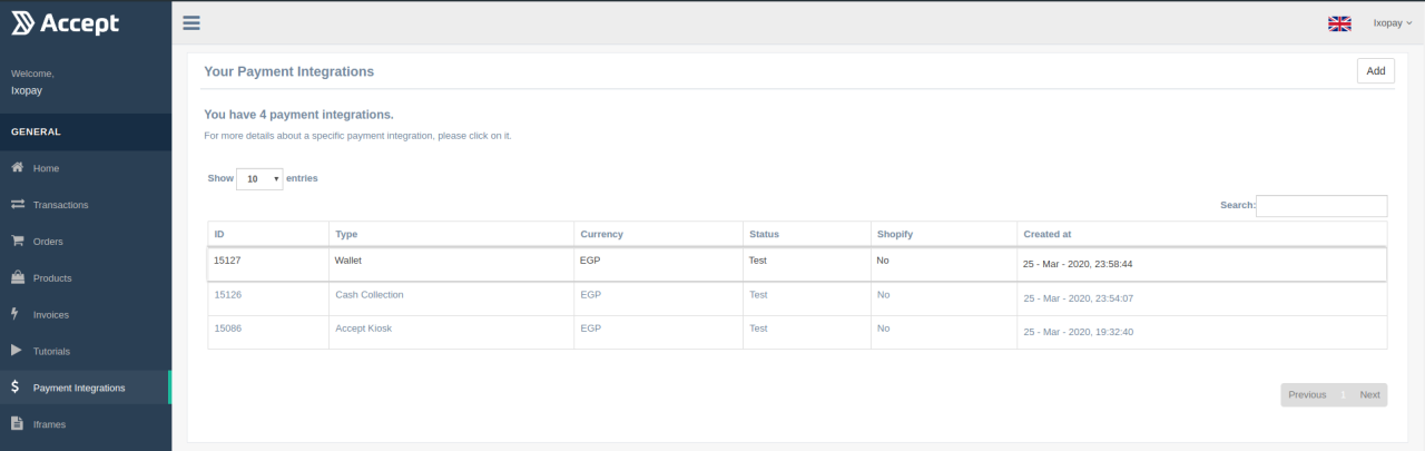 Integration IDs must be generated in WeAccept's Backoffice login (see menu point "Payment Integrations"). New integration IDs may be added by clicking on the "Add" button in the top-right corner. Currently, only "Kiosk", "Cash Payments" and "Wallet" -methods are supported.