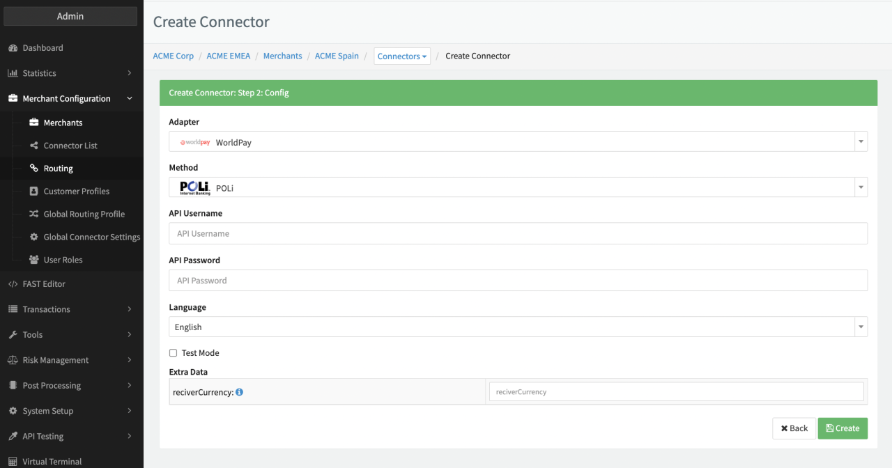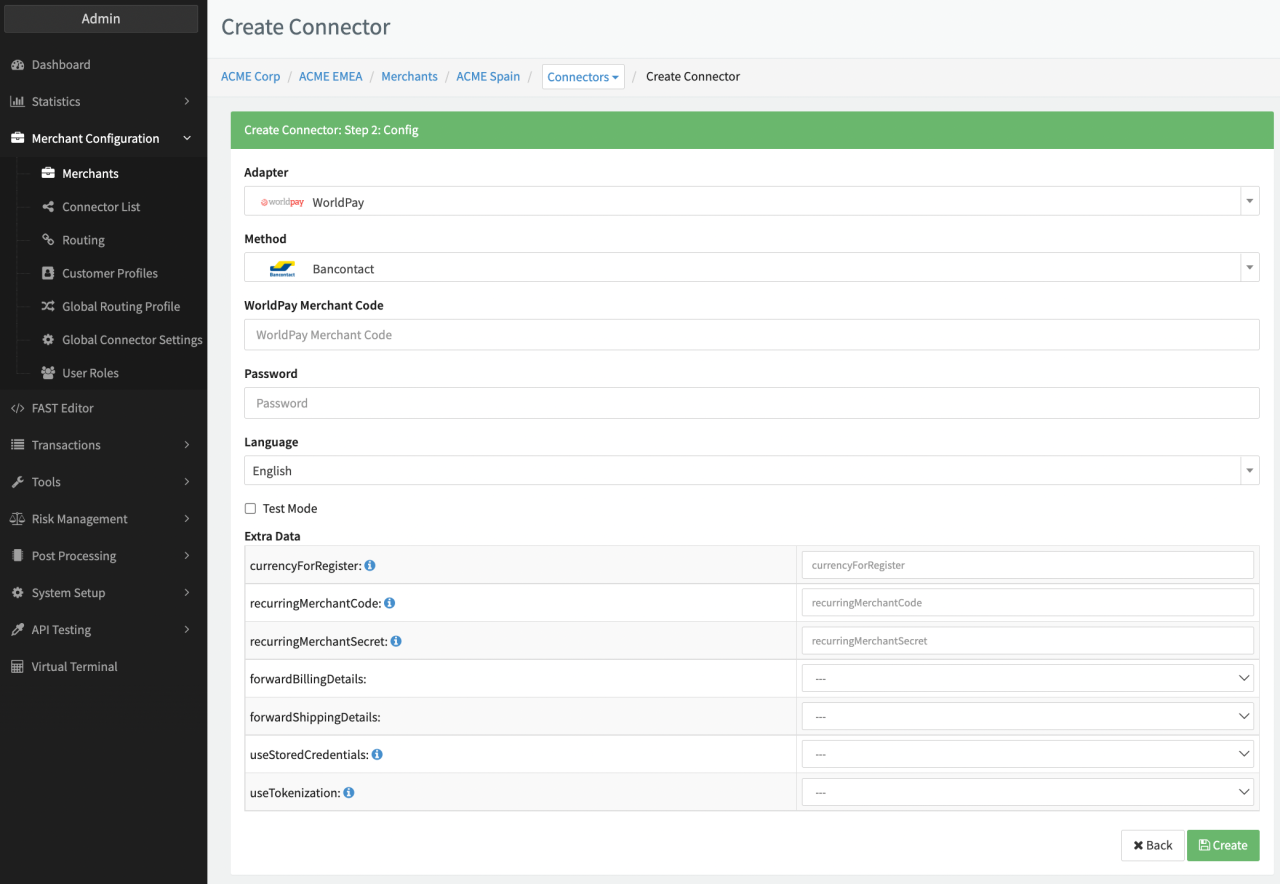 - Fill in the mandatory WorldPay Merchant Code