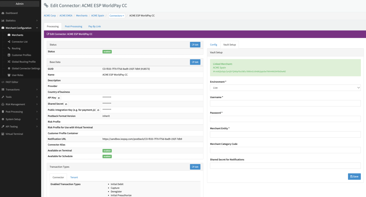 Keep in mind that for PCI compliant Adapters you need to connect with the PCI environment and the PCI Vault Configuration is shown.