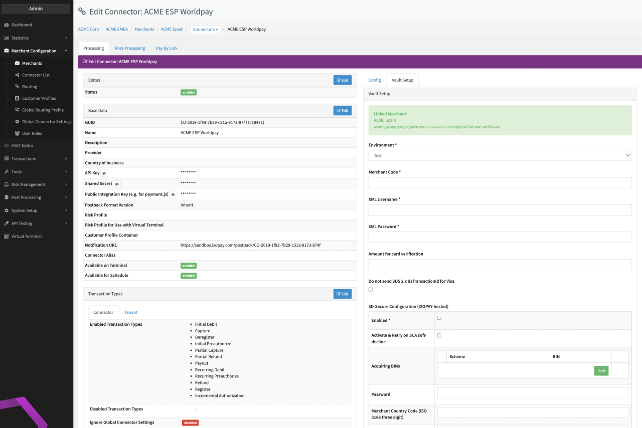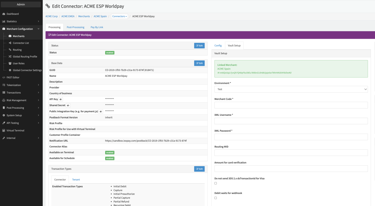 Depending on the chosen Interface Type a subset of the following parameters for the Connector need to be configured (see PCI Vault Configuration - Creditcard WorldPay I, II & III):