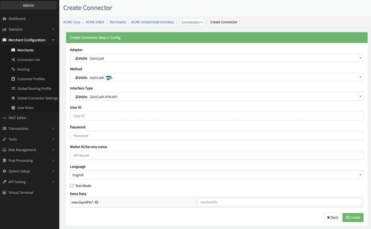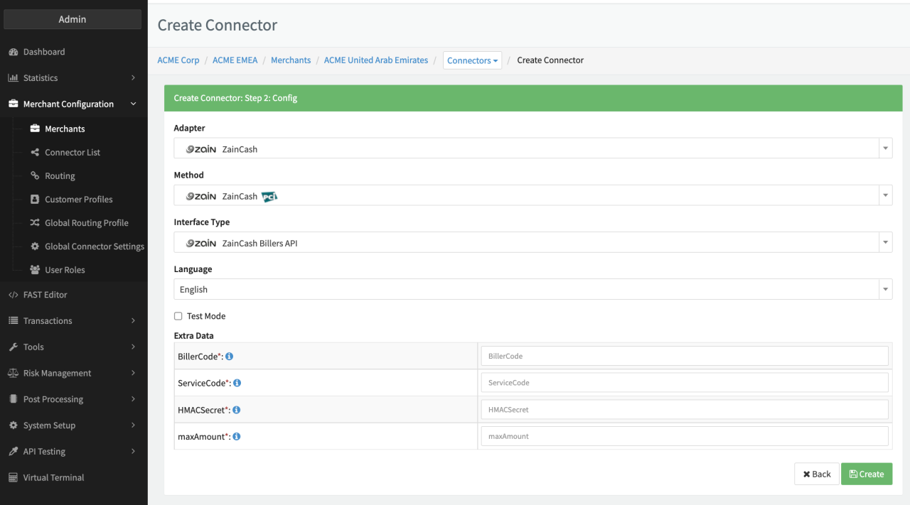 Configure the following parameters for the Connector (see Connector Config - Zaincash):