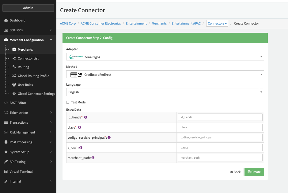 - Fill in the mandatory Extra Data: id_tienda (Zona Virtual unique ID assigned to a company)