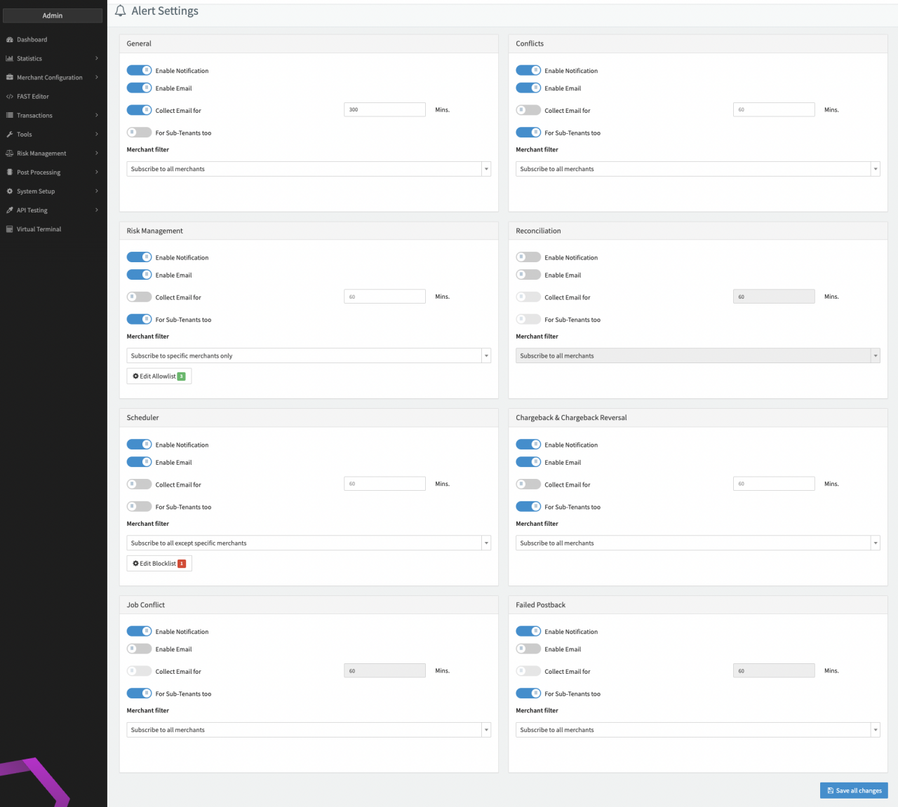 The IXOPAY platform notifies Admin users when their attention is required. Alerts and notifications show up directly on the Dashboard or can be sent via email.
