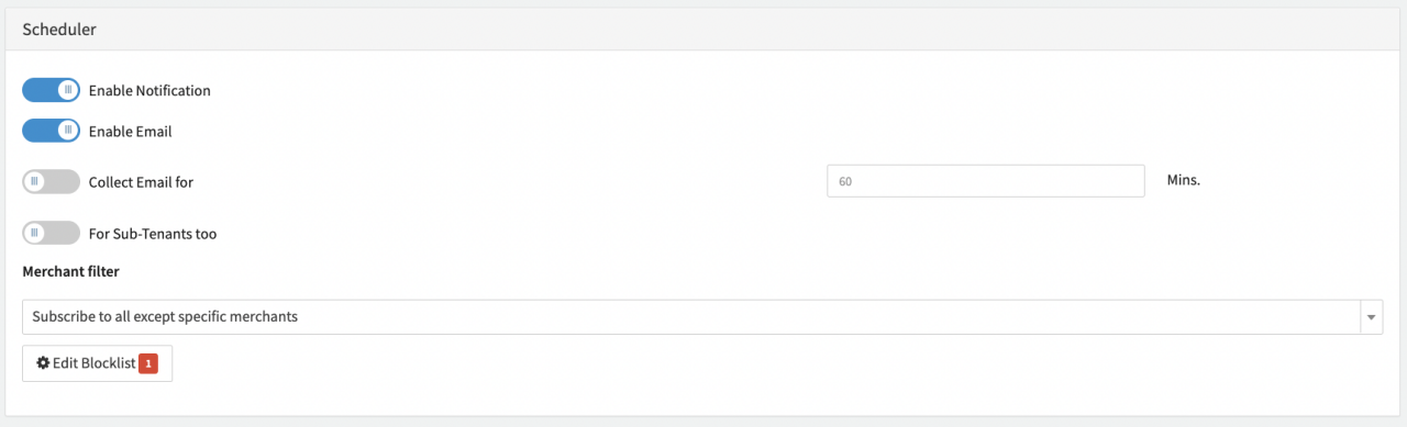 - Subscribe to all except specific Merchants: Click Edit Blocklist to exclude specific Merchants (see Subscribe to all except specific Merchants)