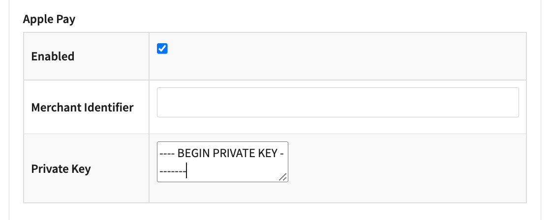 - Fill in the Private Key - This is the private key of your ApplePay Payment Processing Certificate, for further information consult the Apple documentation https://developer.apple.com/documentation/apple_pay_on_the_web/configuring_your_environment