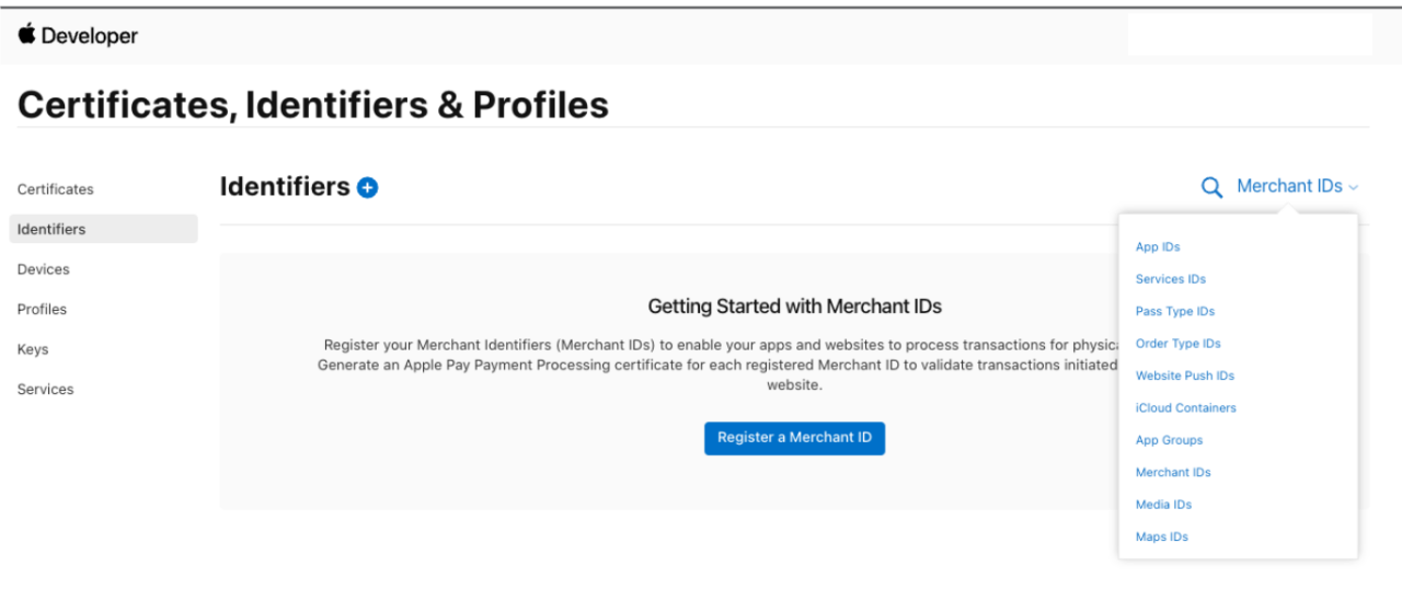 - In Certificates, Identifiers & Profiles, click Identifiers in the sidebar, select Merchant IDs using the filter on the top right. (see ApplePay Developer - Certificates, Identifiers & Profiles II)
