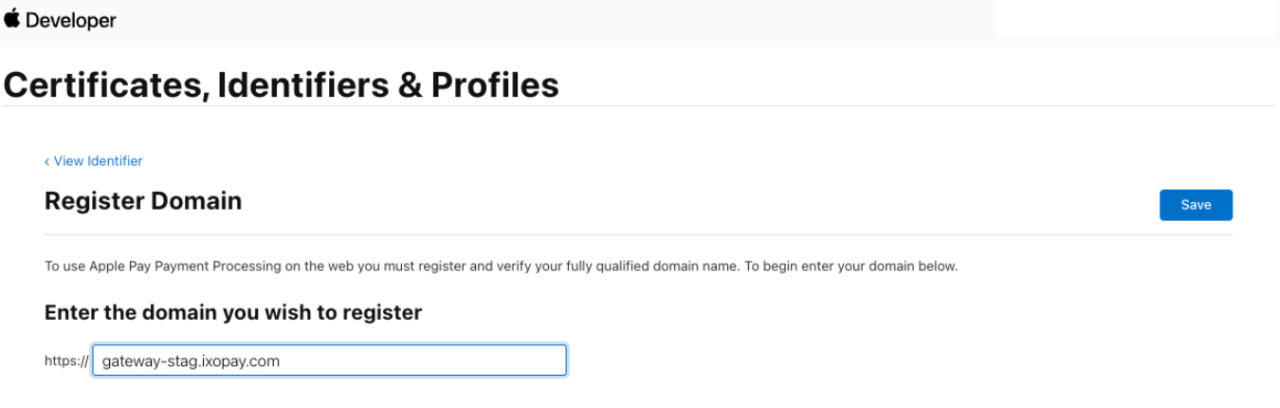 - Fill in the fully qualified domain name, then select Save (see ApplePay Developer - Domain configuration)