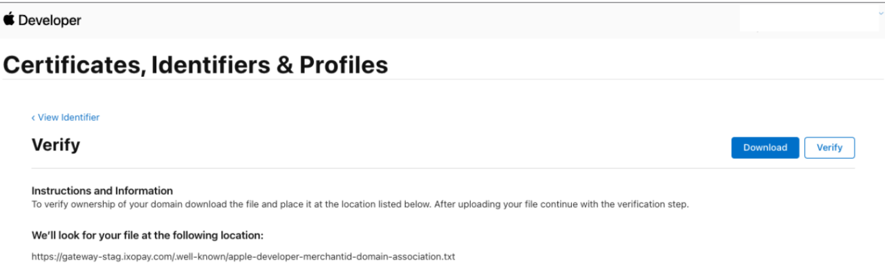 - Select Download, store the downloaded file in the specified location, then select Verify (see ApplePay Developer - Domain Verification)