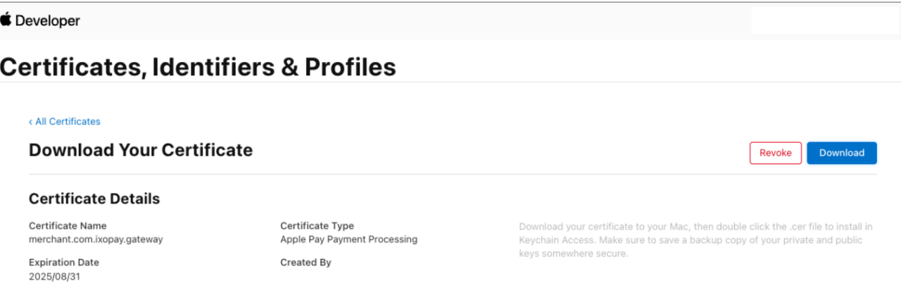 - Select Continue then Download (see ApplePay Developer - Download), the certificate file (file with a .cer file extension) will appear in your Downloads folder.