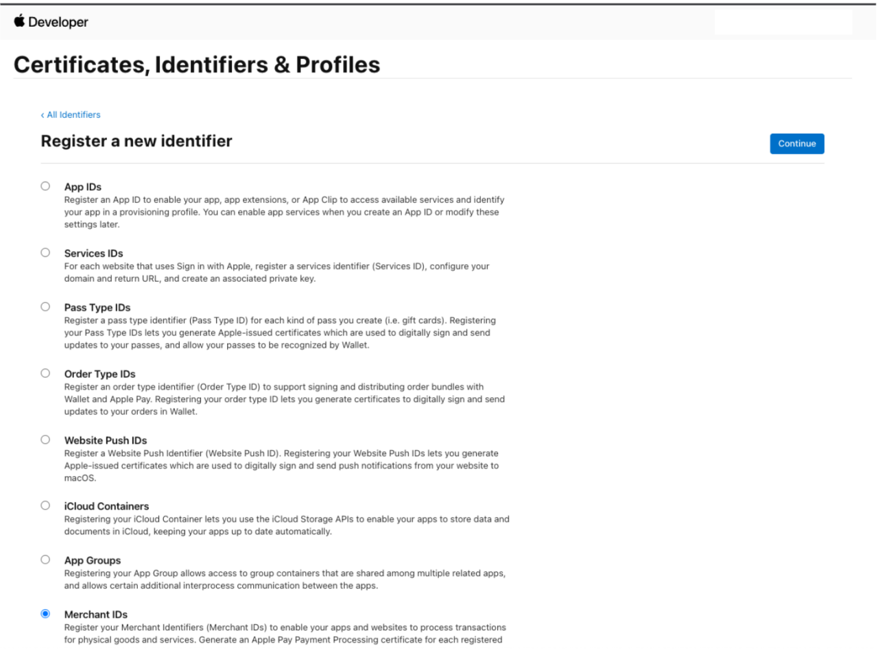 - Select Merchant IDs, then select Continue (see ApplePay Developer - Identifiers)