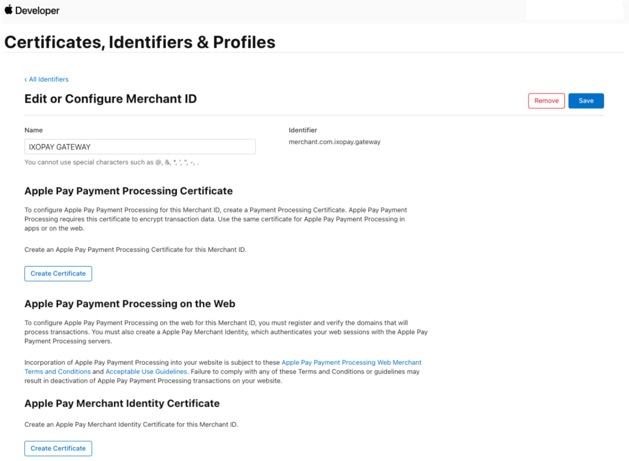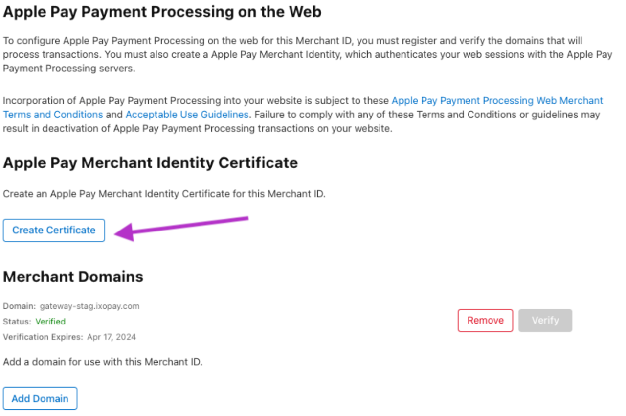 - Under Apple Pay Merchant Identity Certificate, select Create Certificate (see ApplePay Developer - Merchant Identity Certificate)