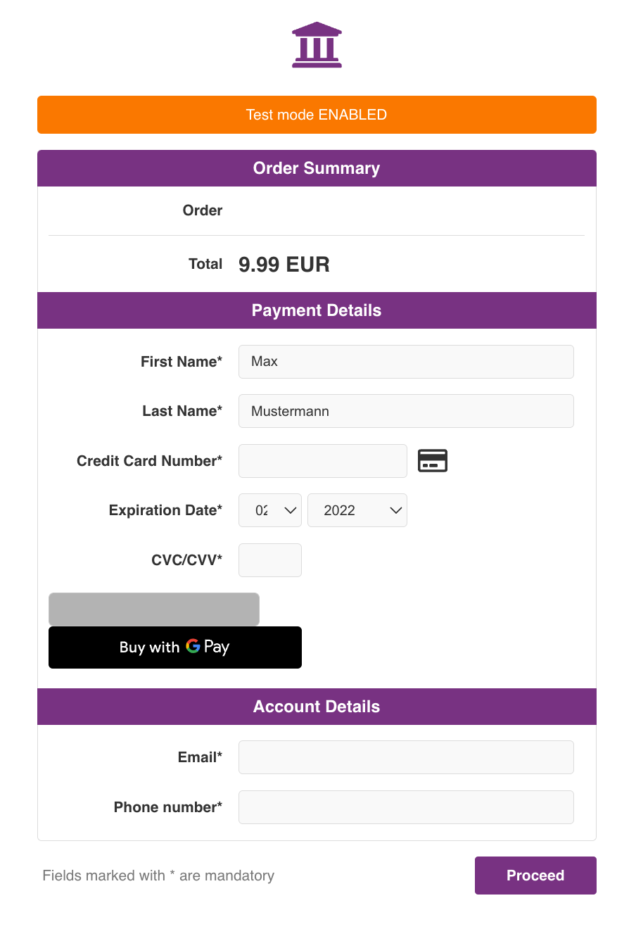 - GooglePay Merchant Name - Parameter provided by Google for the Production environment (see https://developers.google.com/pay/api/web/reference/request-objects#MerchantInfo)