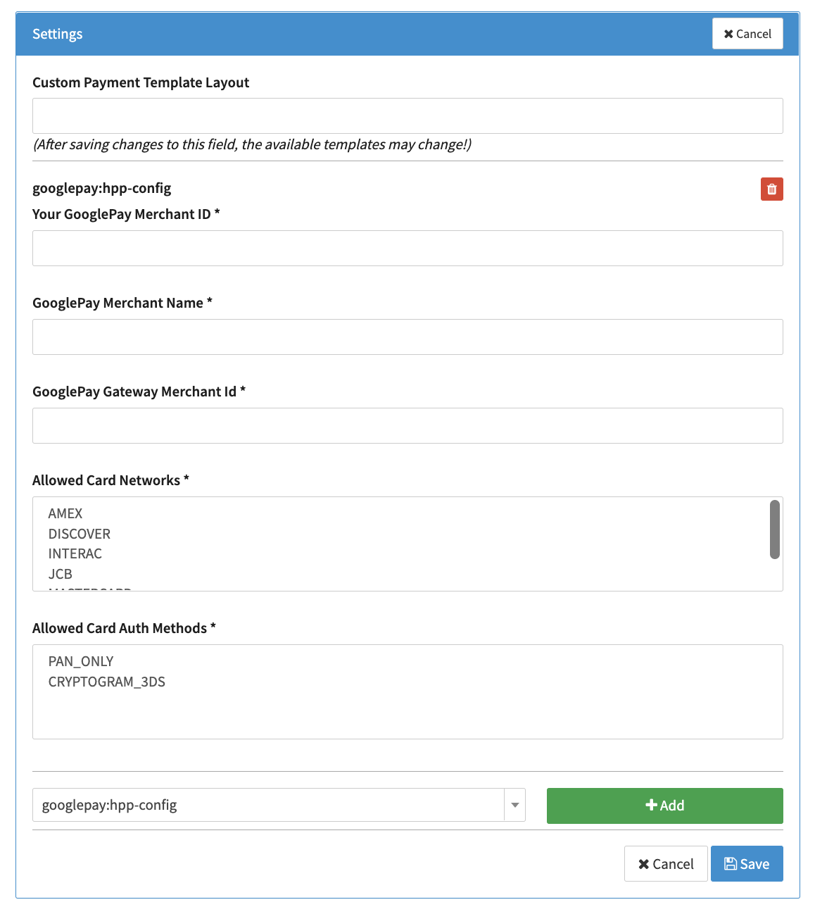 - GooglePay Gateway Merchant Id - Merchant identifier provided by Google to you (same parameter as in the Vault Setup section)