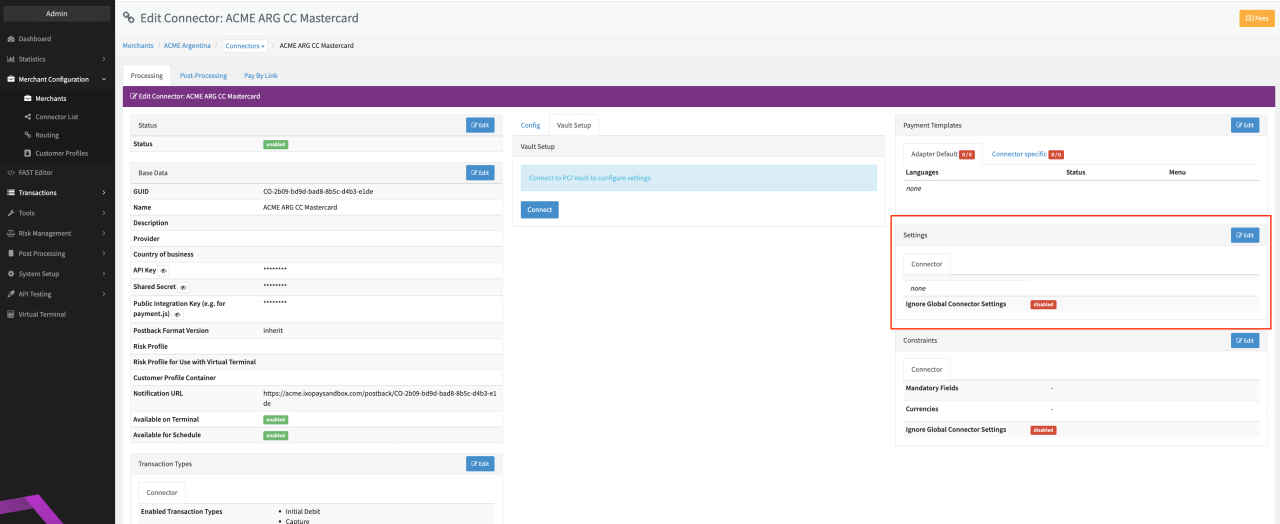 - Click Edit on the Settings section (see Connector Detail Overview)