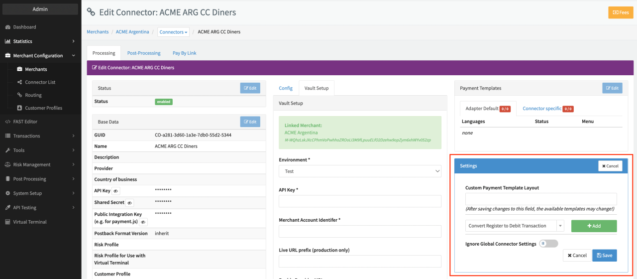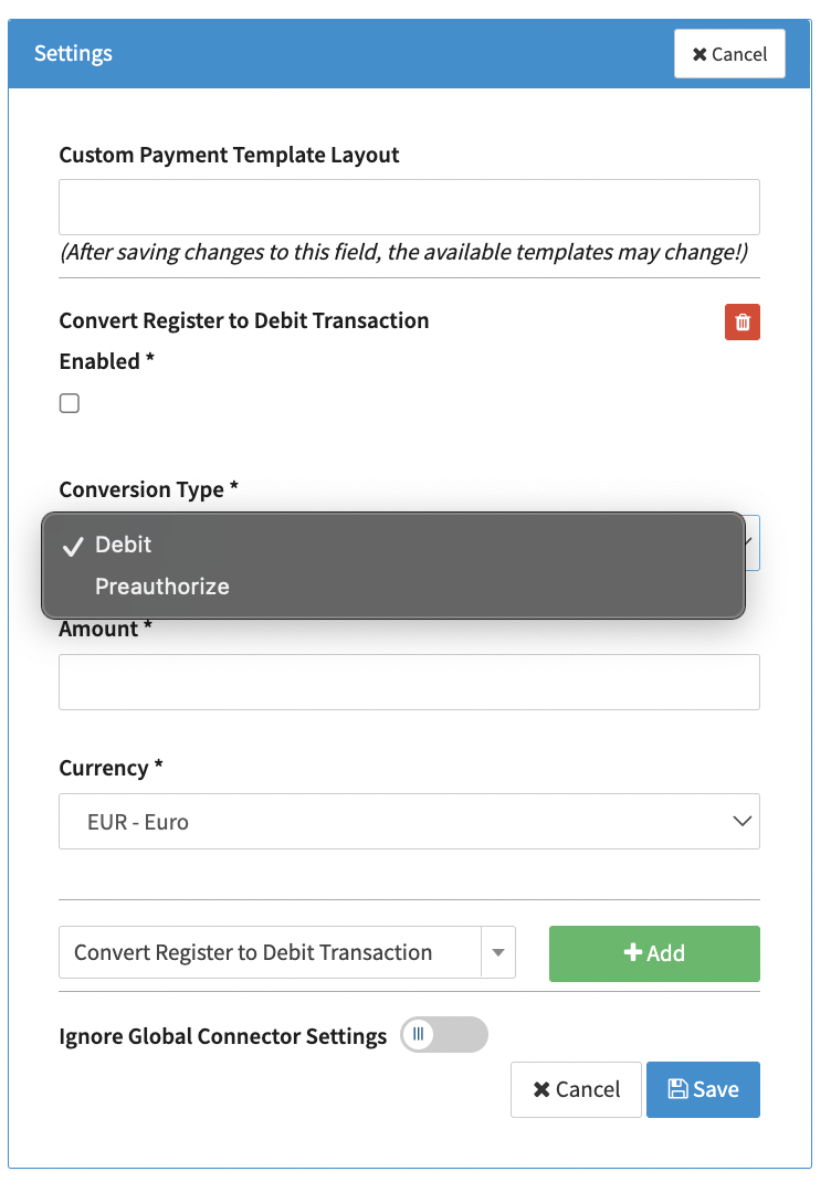 - Select the Connector Setting Convert Register to Debit Transaction and click Add (see Connector Settings)