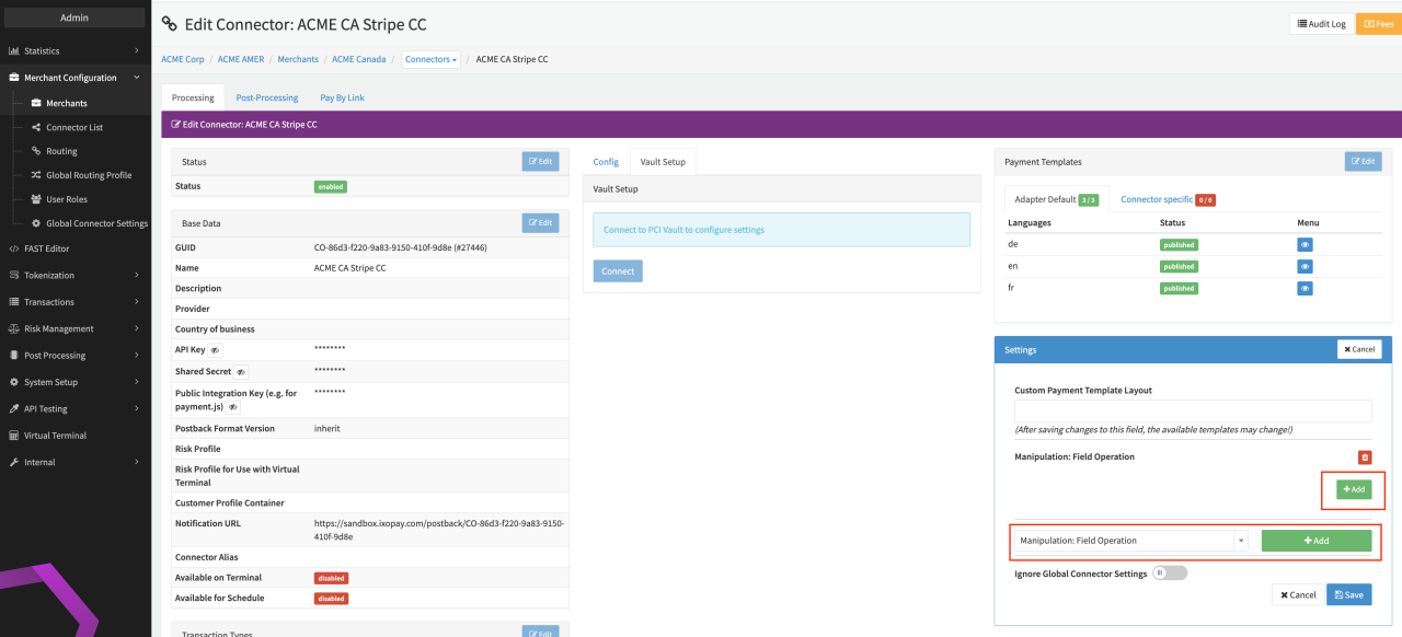 With the Connector Setting Manipulation: Field Operation you can perform manipulation operations to different transaction data fields. The setting is configured per Connector, but can also be configured as a Global Settings.