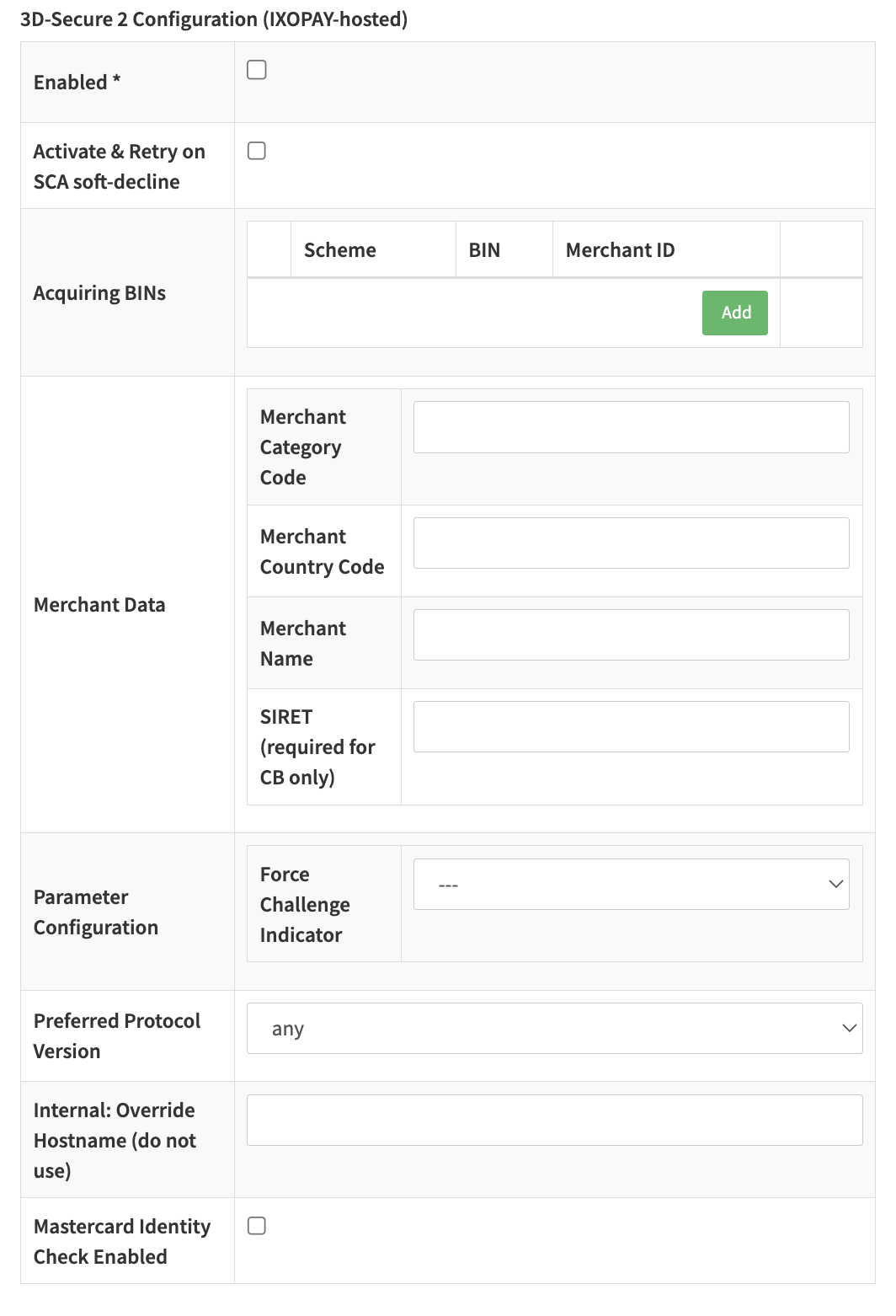 - Mastercard Identity Check Insights Enabled: Enables the Mastercard Identity Check Insights feature; only applicable for Challenge Indicators None or Optional.