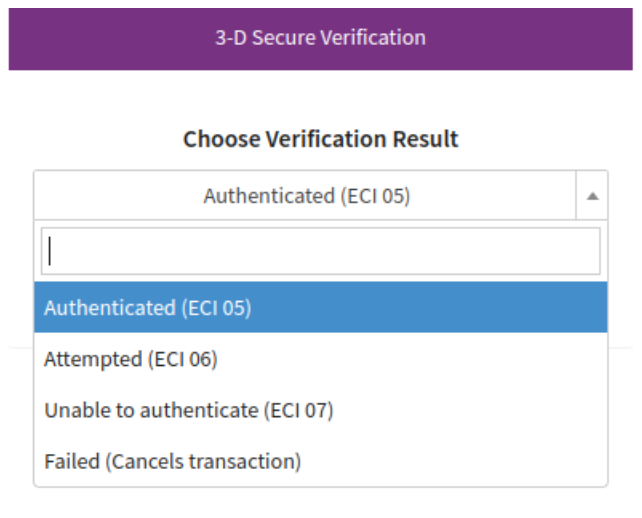 If activated, an additional 3D-Secure Verification Screen is shown during the payment process with dropdown field Choose Verification Result to select the outcome (see 3D-Secure Verification Screen). The status of the Transaction will then be set depending on the used testcard.
