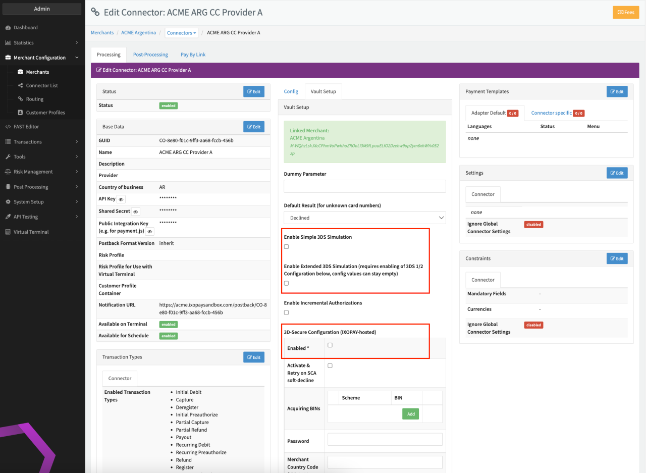 Testing IXOPAY-hosted 3D-Secure Configuration with the PSP's/Acquirer's test environment can be done by enabling the Connector Setting Mock 3D-Secure Flow for Testing in the IXOPAY-hosted 3D-Secure 2 Configuration.