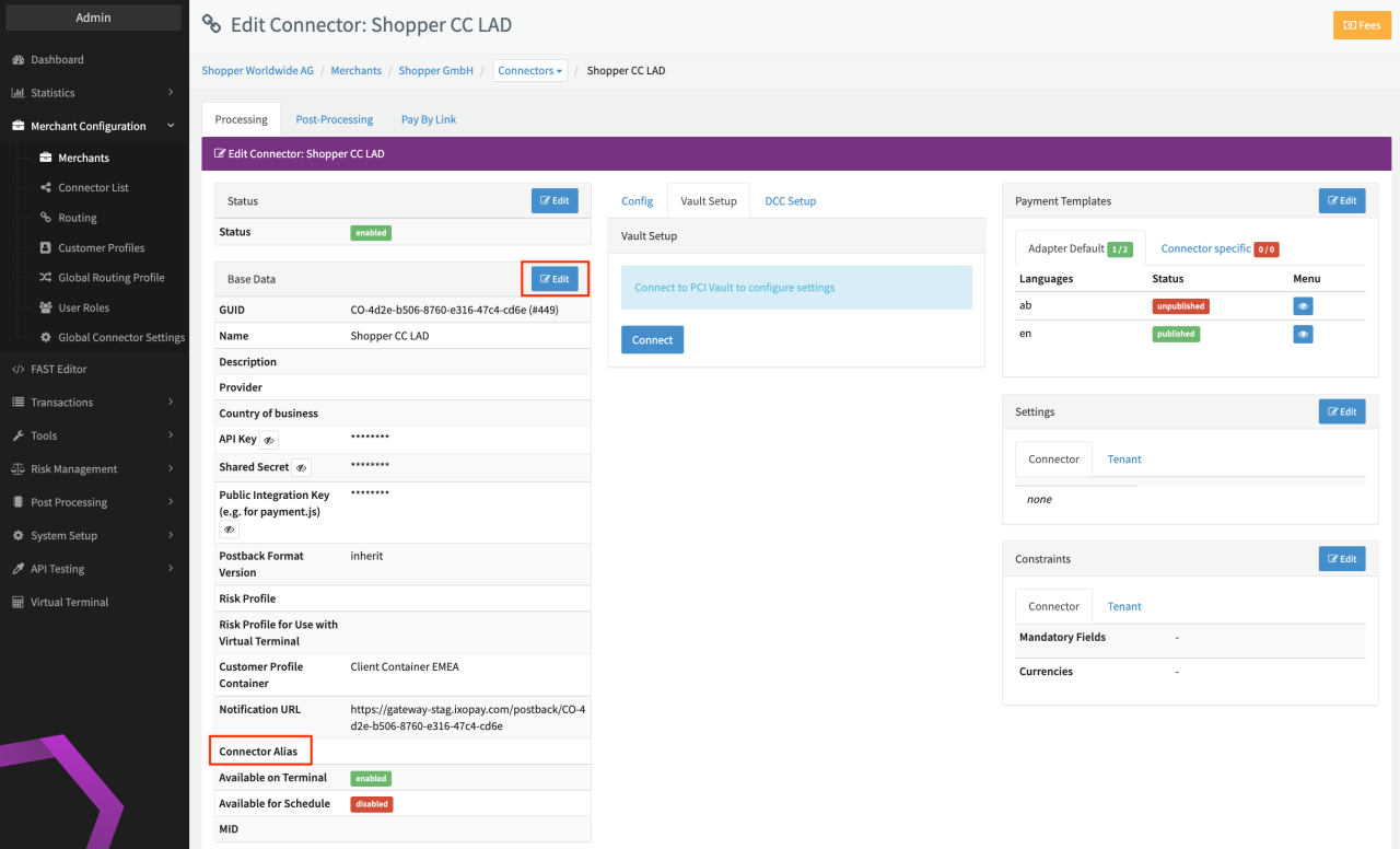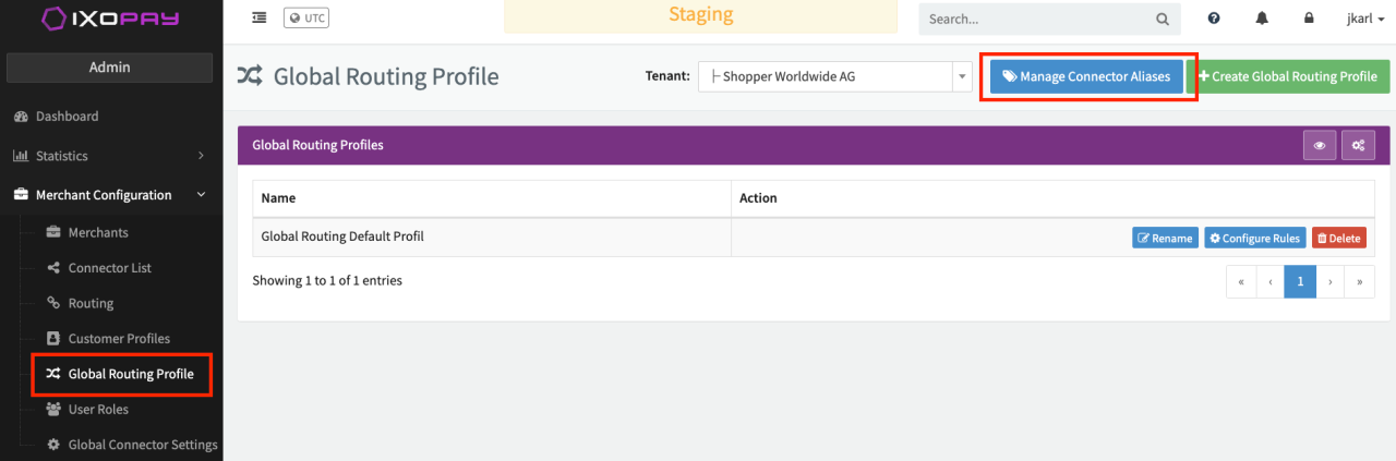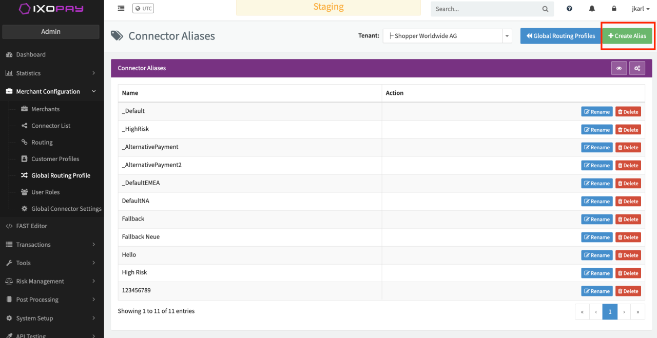 Since every merchant will probably have a slightly different connector setup, IXOPAY uses aliases to achieve a layer of abstraction. These aliases are used to define global routing profiles to suffice any connector setup you may have. Therefore aliases will be mapped to connectors at the merchant level.