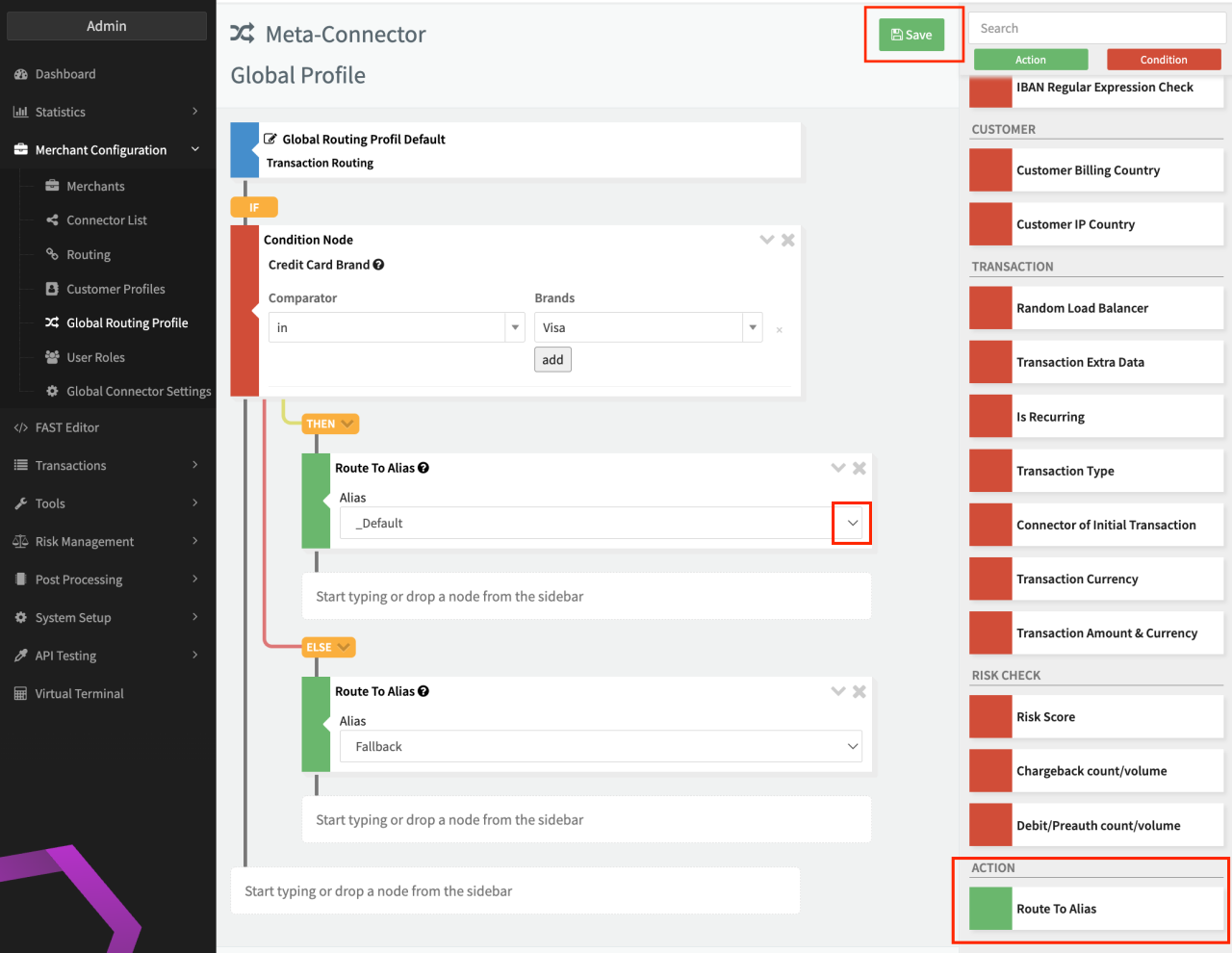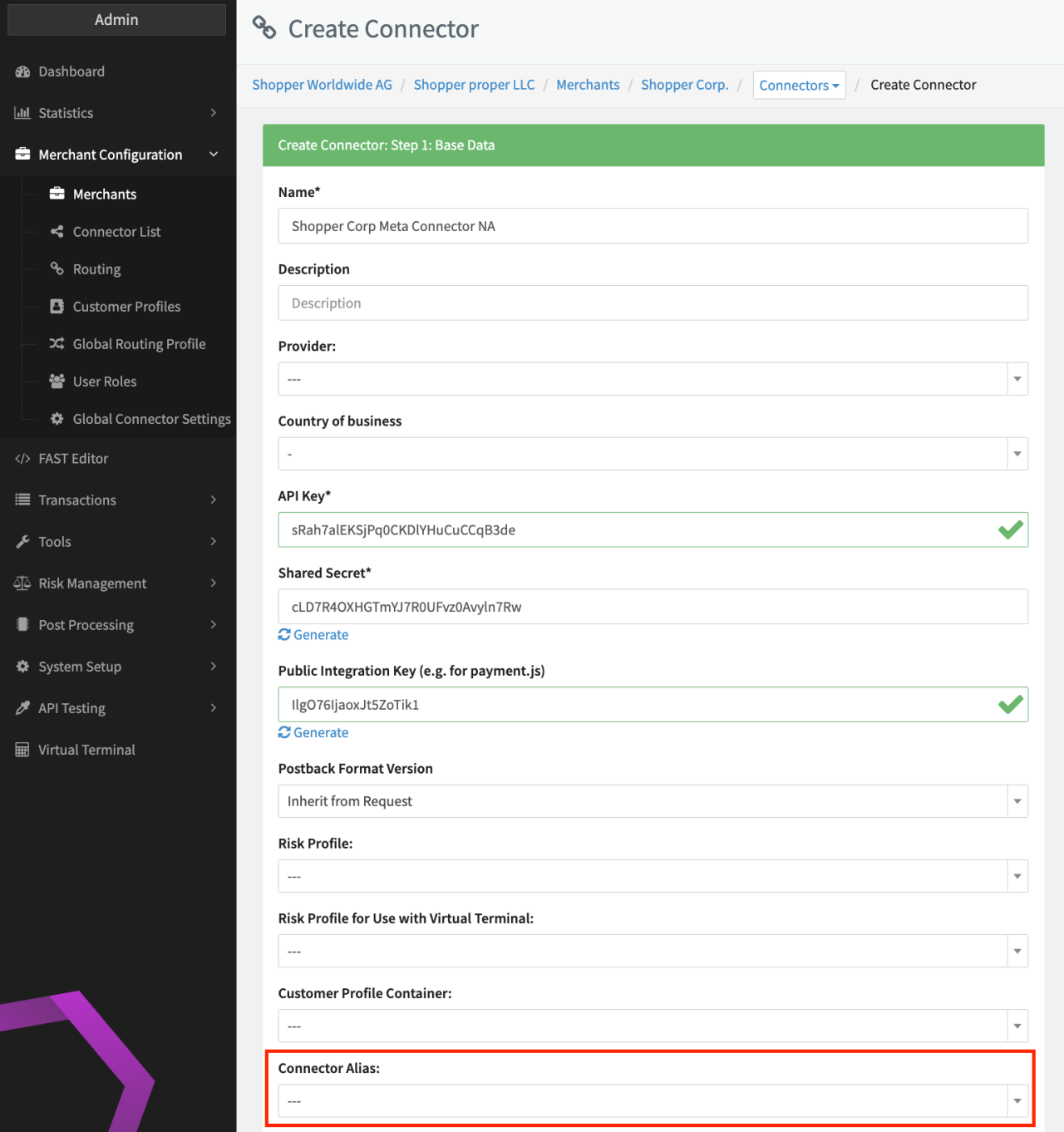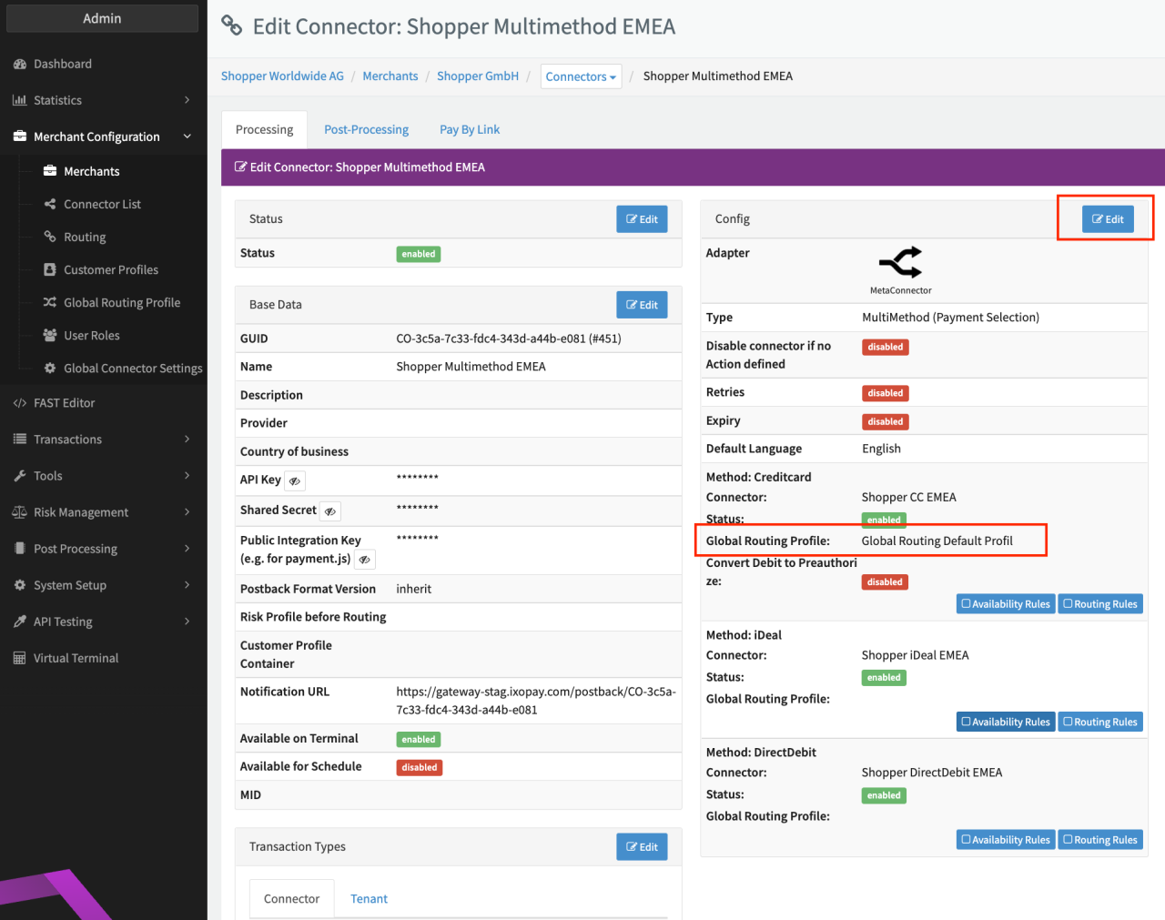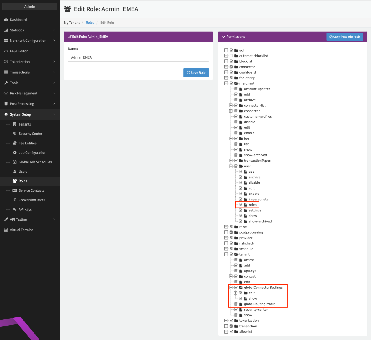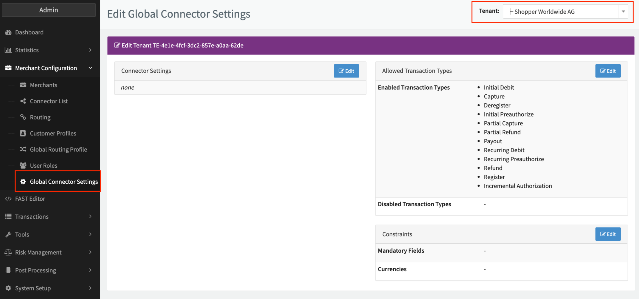 To be able to setup the feature, the permissions "tenant.globalConnectorSettings", "tenant.globalRoutingProfile" and "merchant.user.roles" must be enabled for your tenant and activated for your Admin User Role (see Permissions Admin User).