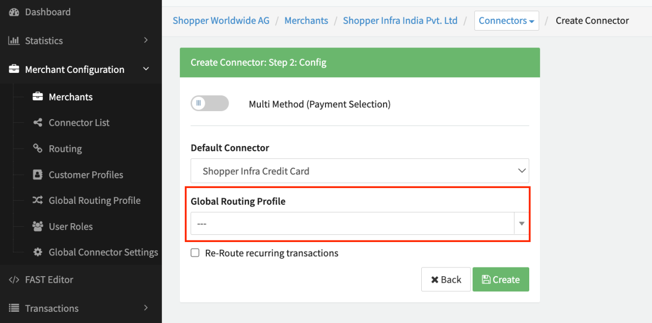 After creation, a Global Routing Profile can either be added to an existing Meta Connector or selected when creating new Meta Connectors. For Multi-Method Meta Connectors a Global Routing Profile can be selected per payment method.
