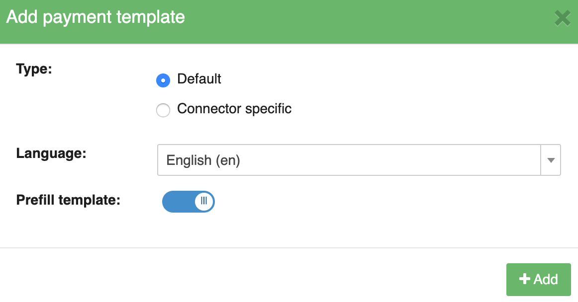 - Select the type of template, language and whether you want to prefill the template (see Add template)