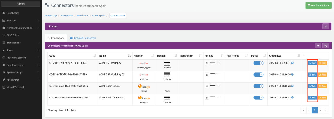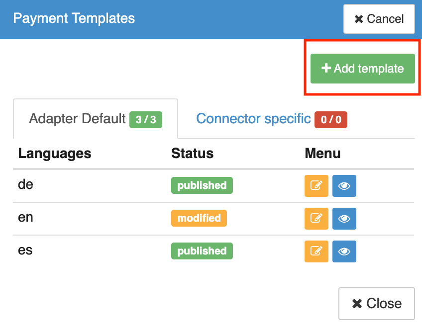 The Payment Templates section has two tabs: each of them contains existing page templates which are either Adapter-wide, or Connector-specific. Connector-specific templates are those, which are used solely for the Connector they were created on. Adapter-wide, on the other hand, means that the template will be used for every Connector that uses the same Adapter as the Connector where the template was created on. If a Connector has both, an Adapter template and a Connector-specific template, it will use the more specific one, i.e. the Connector template over the Adapter template.