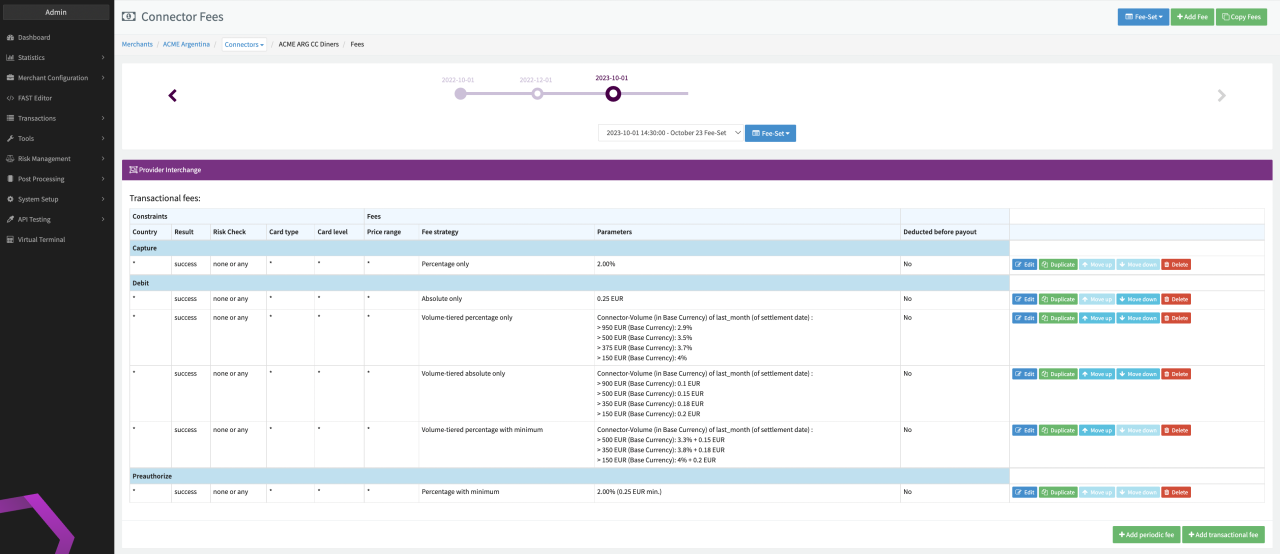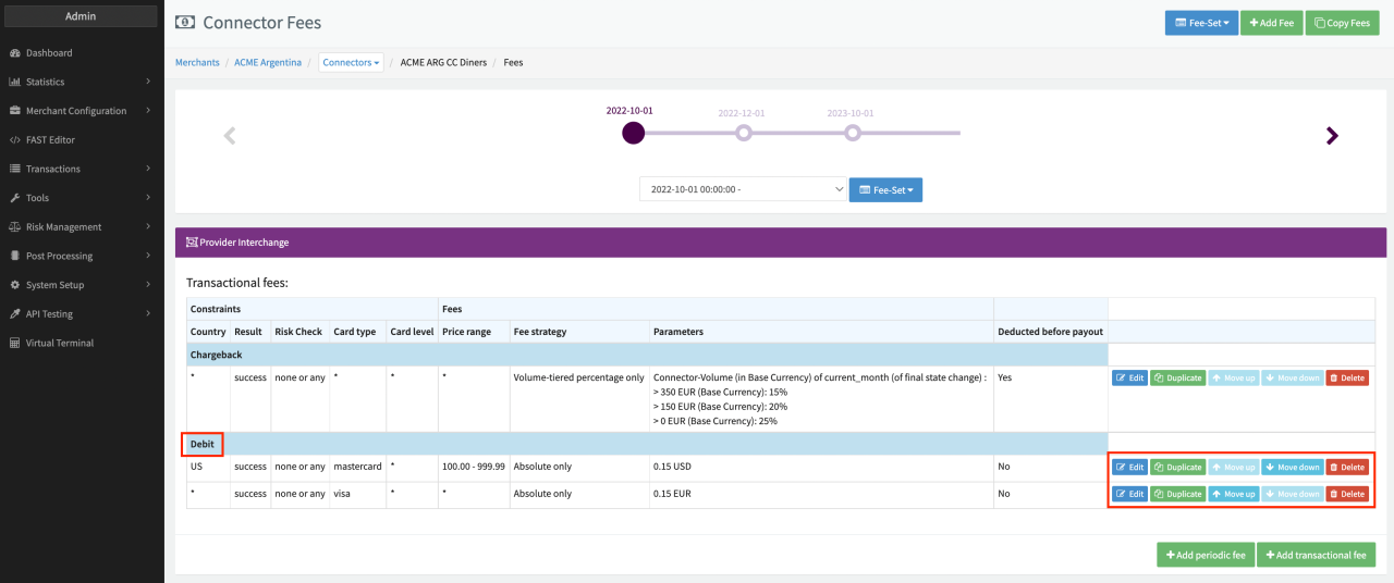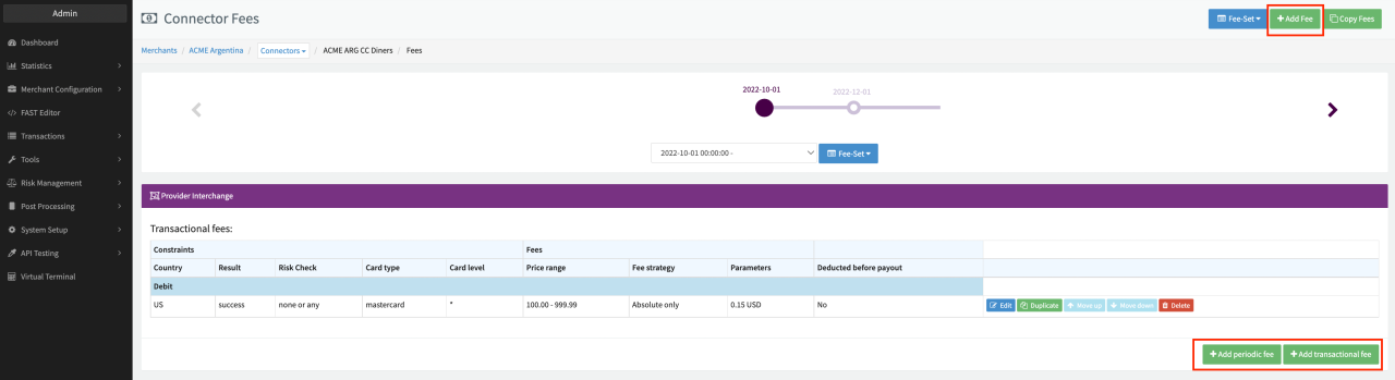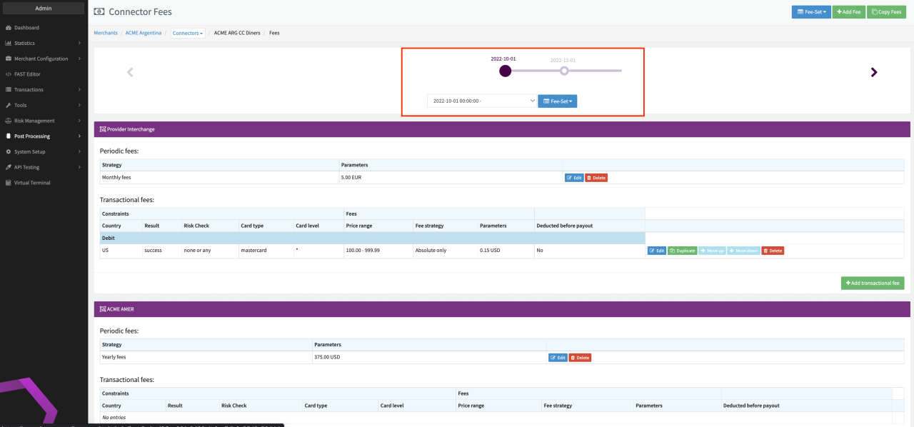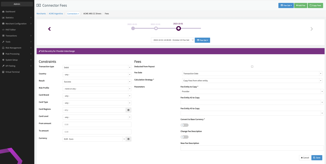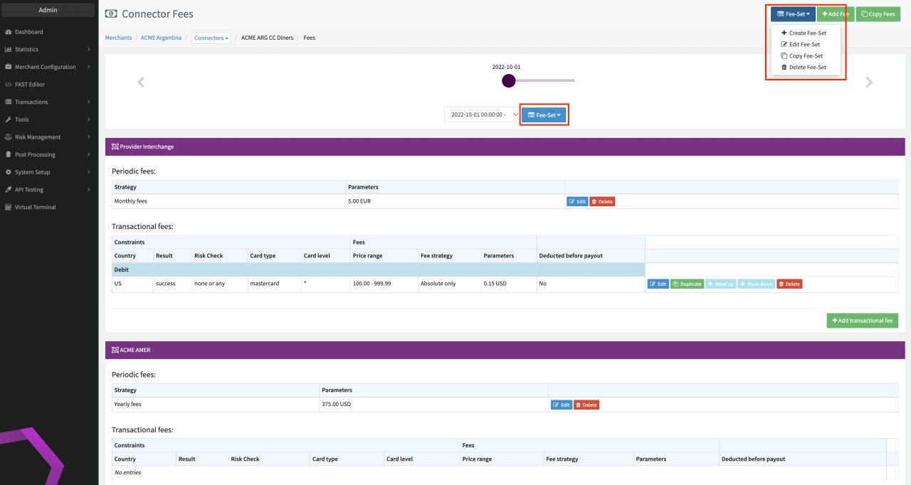 In case you want to use an already configured Fee-Set on multiple Connectors of the same or a different Merchant, the option Copy Fees (of an existing Fee-Set) might be useful.