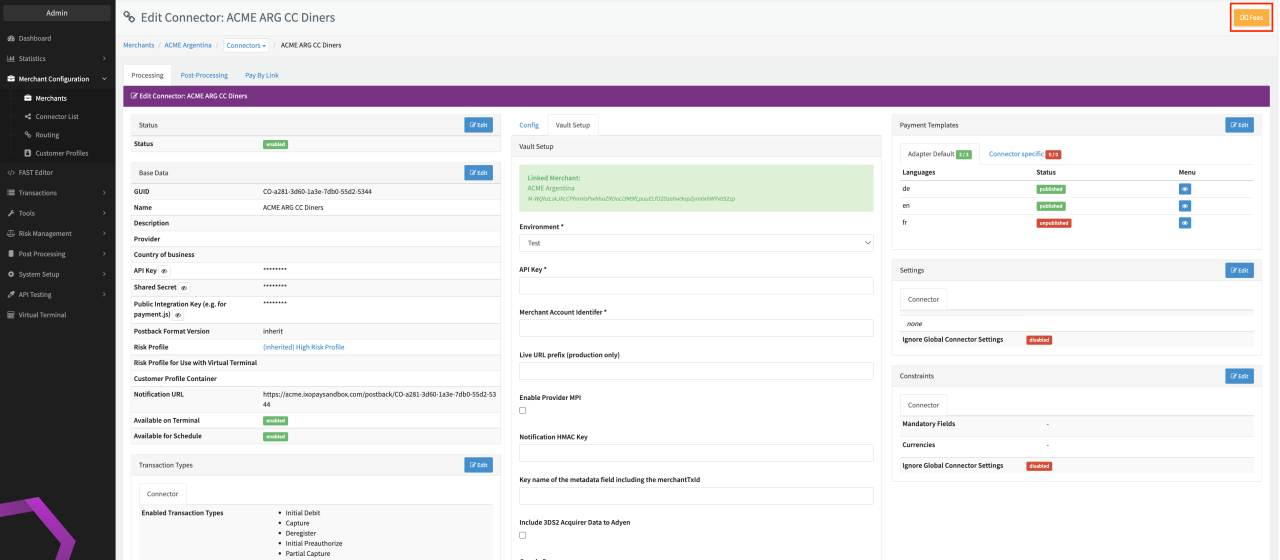 - Navigate to the Connector Overview and Click Fees for the desired Connector. Alternatively, navigate to the Connector Details Overview and Click Fees.