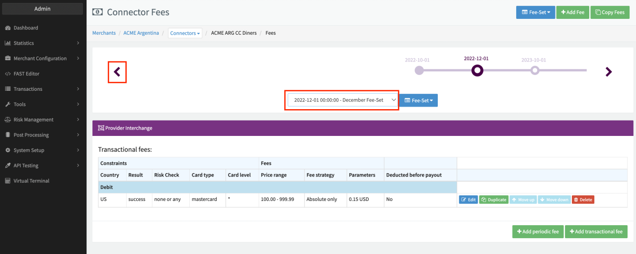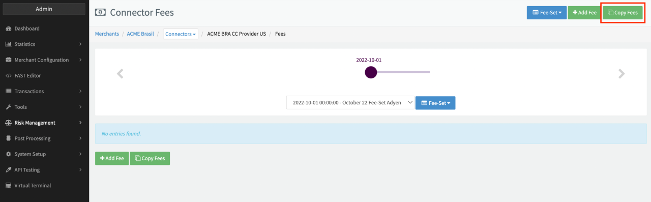 Fee-Sets can only be copied within the same Connector Fees. If you want to copy fees across Merchants see section Copy Fees.