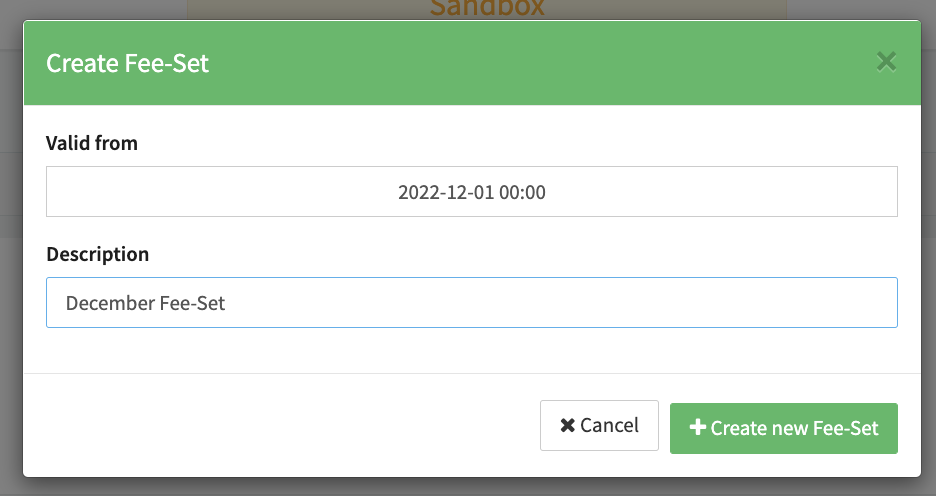 - Select a Valid from Date and Time and fill in an optional Description for the Fee-Set (see Create Fee Set).