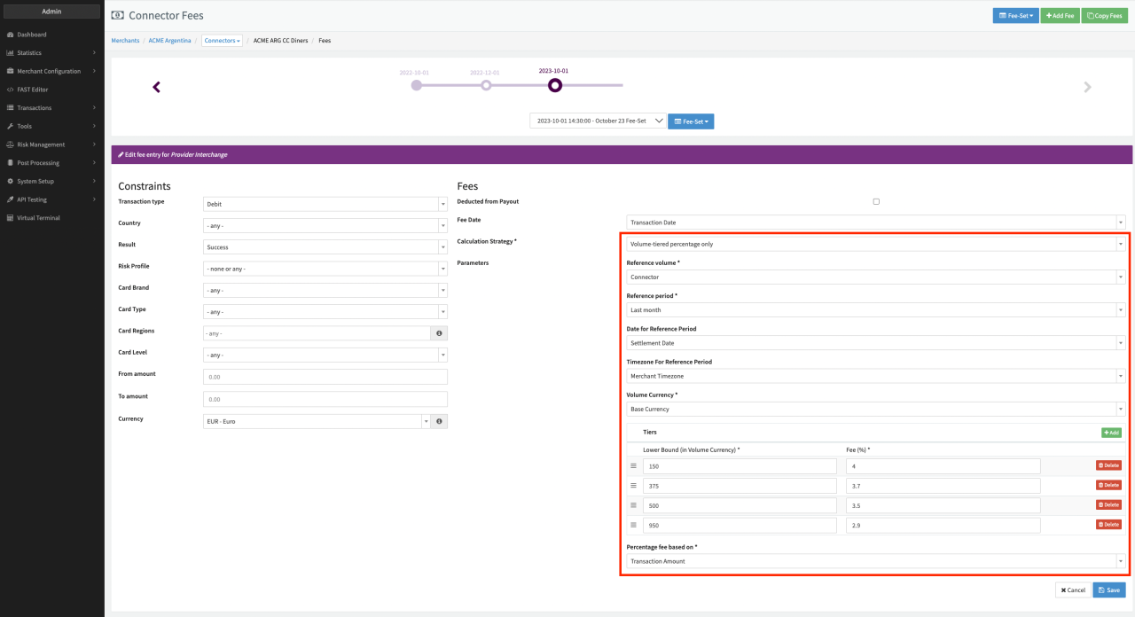 - Volume-tiered: Volume-tiered strategies depend on the overall transaction / settlement / outg. settlement / base currency Amount within a reference period and entity (Merchant, Connector).