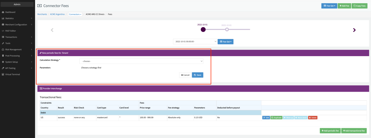 Periodic Fees, in comparison to transactional Fees, are applied based on a time period instead per Connector. You can only configure one periodic Fee per Fee Entity.