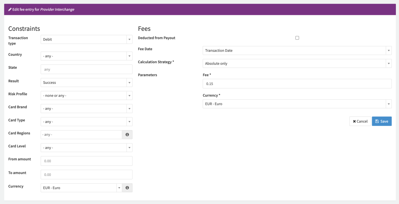 and start with the Fee Configuration. There are two sections to configure Constraints and Fees (see New Fee Entry). Within the Constraints section you define criteria for the Transaction to meet in order for the Fees to be applied (see the Constraints table for Configuration Details).