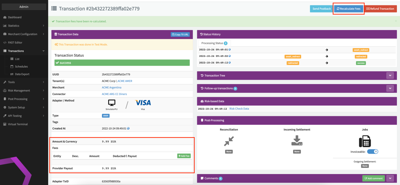 As soon as you defined your Fee structure on Connector level each Transaction will be queued for calculation when created and again with every status change, since Fees can also be applied based on the Transaction result. Depending on the load, this might result in a display delay of Fees within the Transaction Details (up to 10 minutes).
