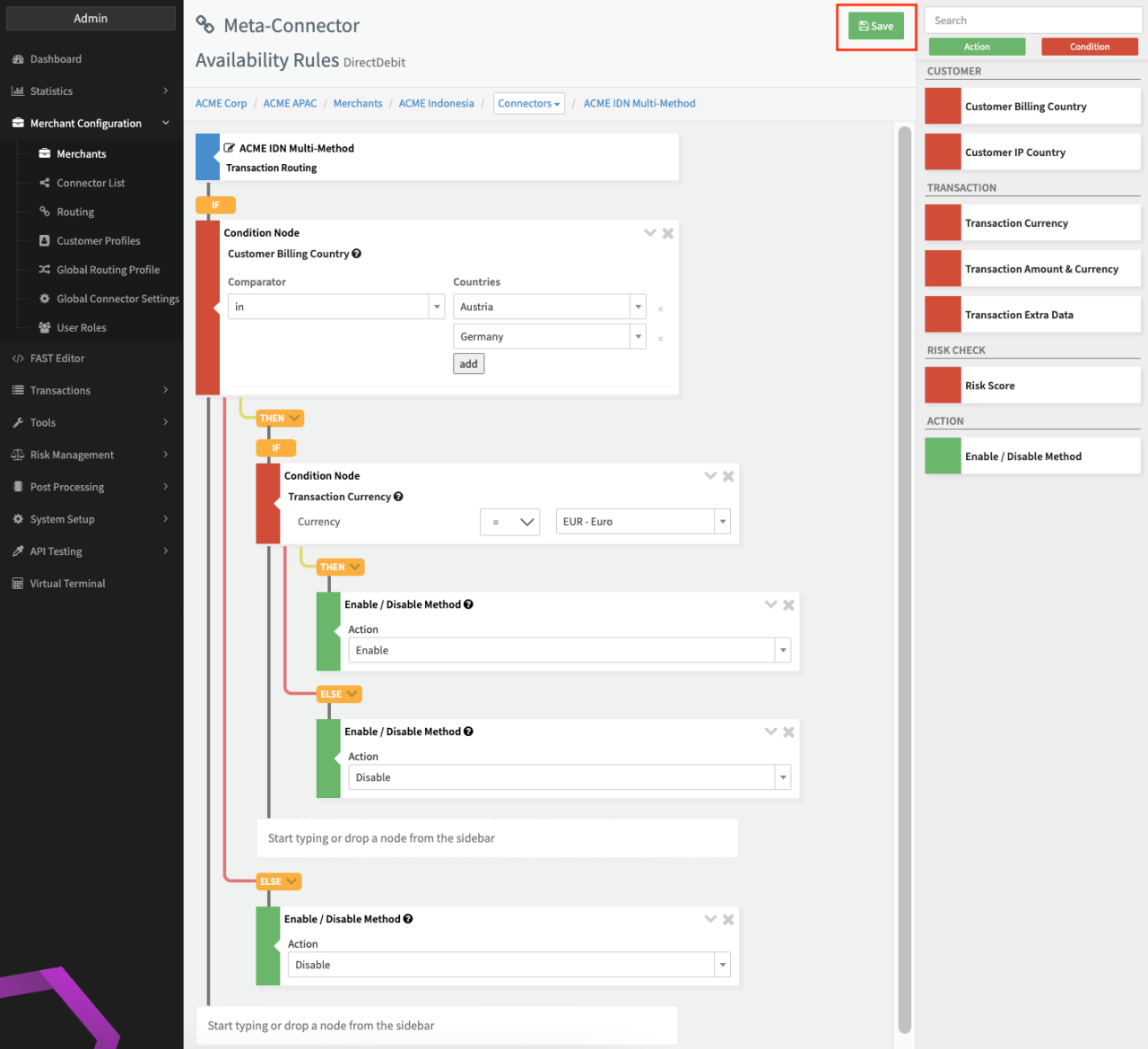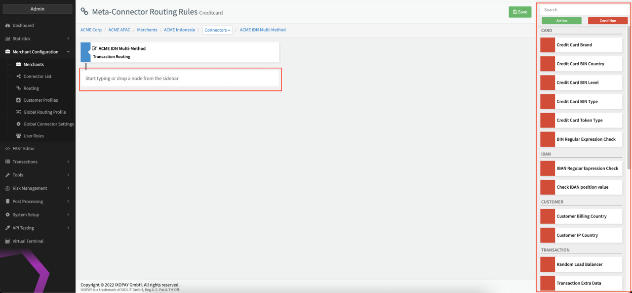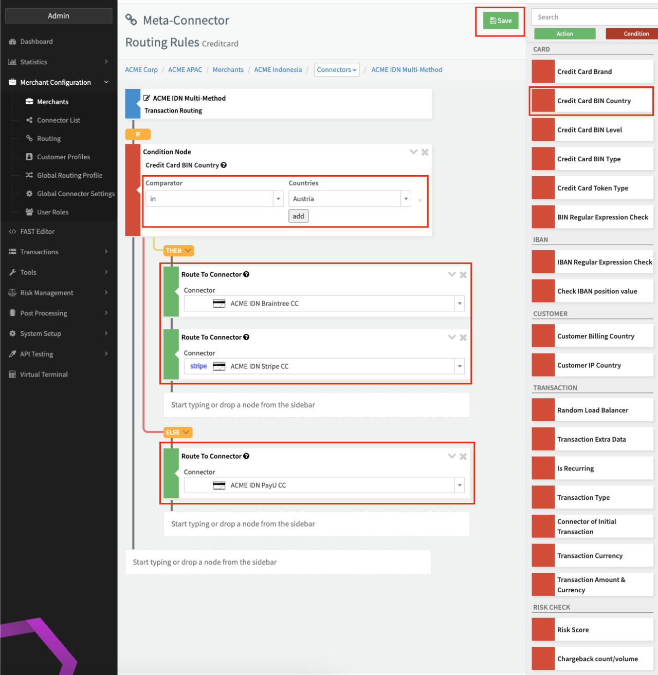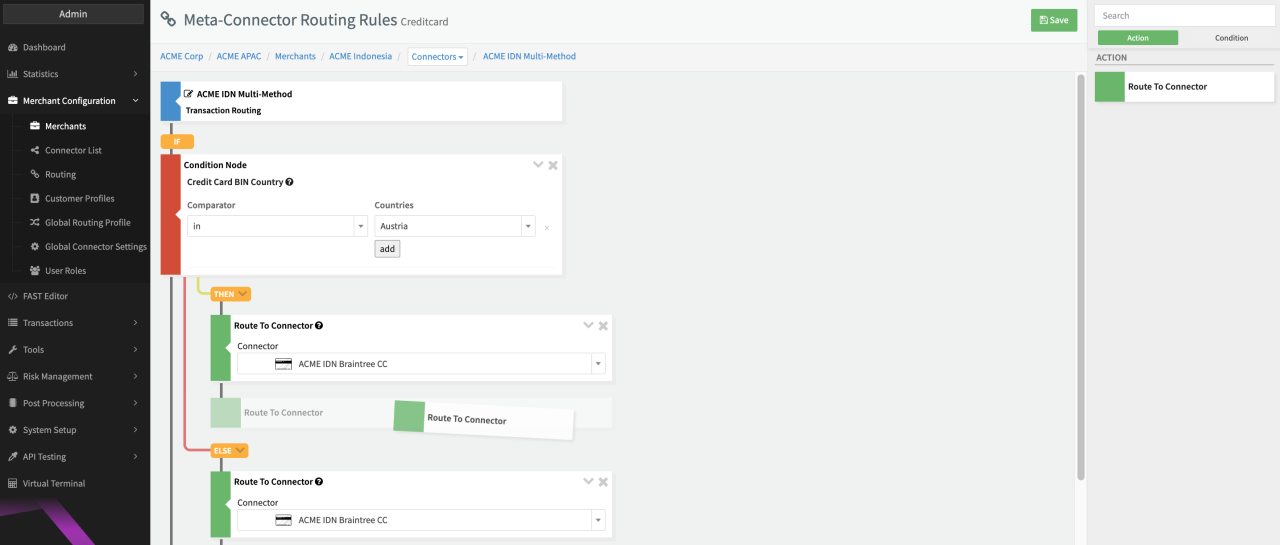 Let's assume we want to route Transactions based on the BIN country of the credit card. If the BIN Country is Austria, the Connector ACME IDN Braintree CC is used (see Routing Rule - Example). If this Connector experiences issues the Transaction would be routed to ACME IDN Stripe CC. Lastly, in case the BIN Country is not Austria, the Transaction will be routed to ACME IDN PayU CC.