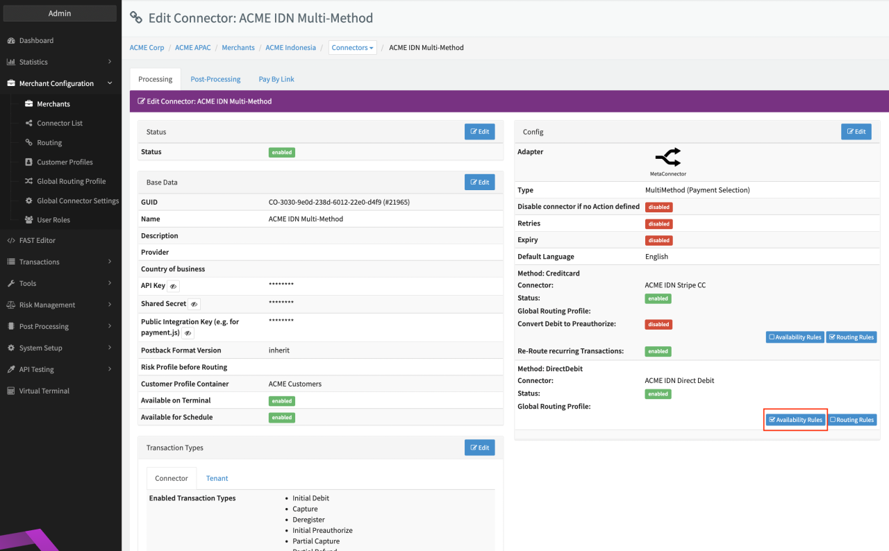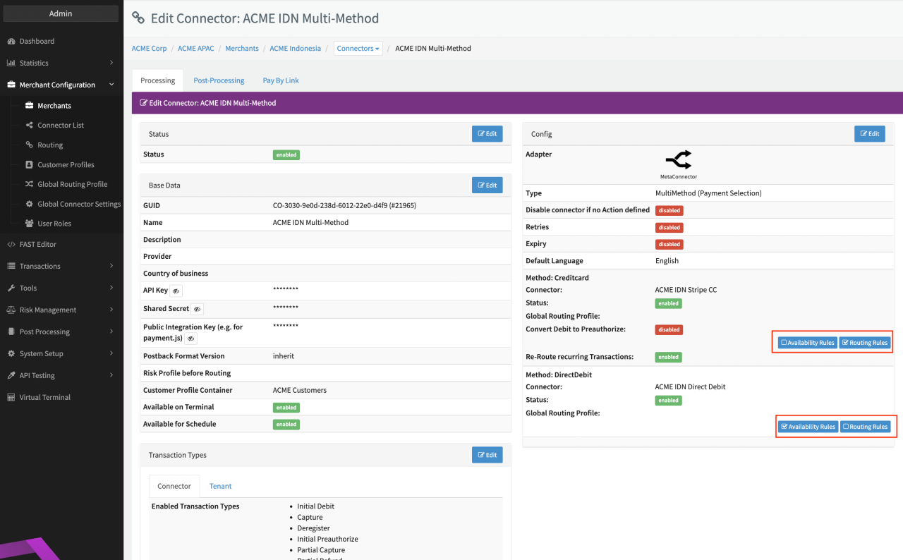 For each enabled payment method the Config section of the Connector Details Overview shows now to Buttons Availability Rules and Routing Rules.
