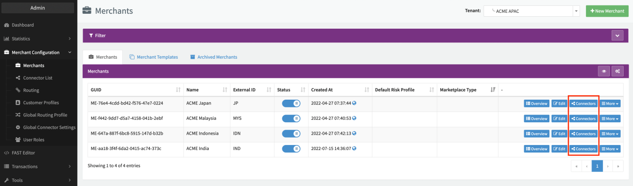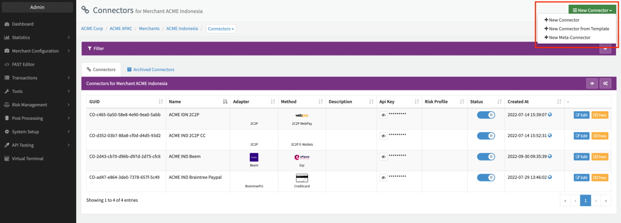 - From the Merchant Overview navigate to the Connectors Overview of the Merchant for which you want to create the Multi-Method (Meta-)Connector